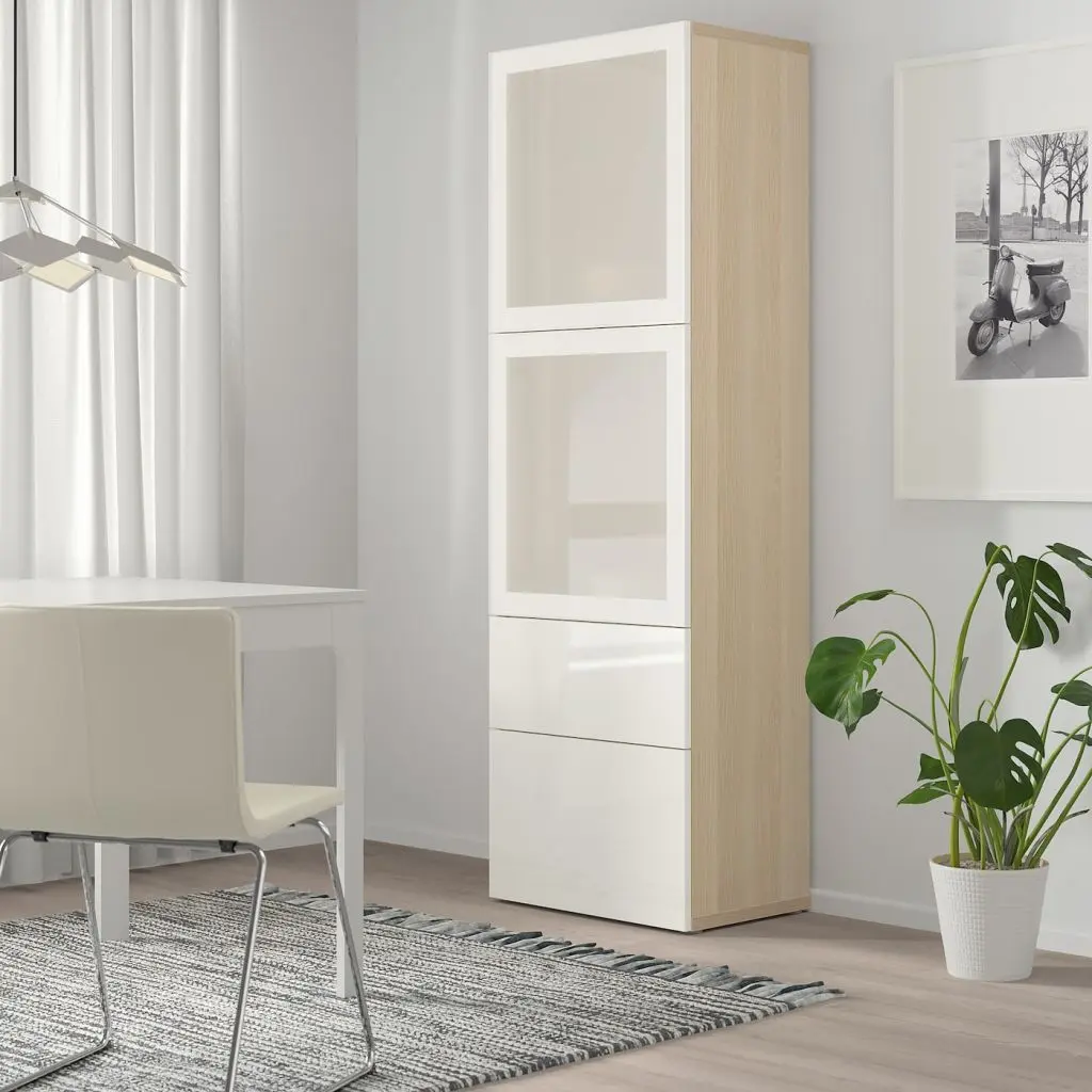 Благодаря доводчикам ящики закрываются плавно и бесшумно.Стеклянные дверцы обеспечивают обзор содержимого, защищая его от пыли.Два ящика и полки за дверцами обеспечат достаточно места для хранения.Съемные стеклянные полки позволяют регулировать пространство.Закаленное стекло – более ударопрочный материал, чем обычное стекло.Эту мебель необходимо крепить к стене с помощью прилагаемого стенного крепежа.Будьте осторожны при обращении с закаленным стеклом! Из-за поврежденных краев и царапин на поверхности стекло может внезапно разбиться.Для разных стен требуются различные крепежные приспособления. Подберите подходящие для ваших стен шурупы, дюбели, саморезы и т. п. (не прилагаются).Внутренние элементы для организации хранения в модулях БЕСТО продаются отдельно.Если вы выберете функцию плавного закрывания, рекомендуем дополнить фасады ручками, чтобы открывать ящики/шкафы было удобнее.Дизайнер