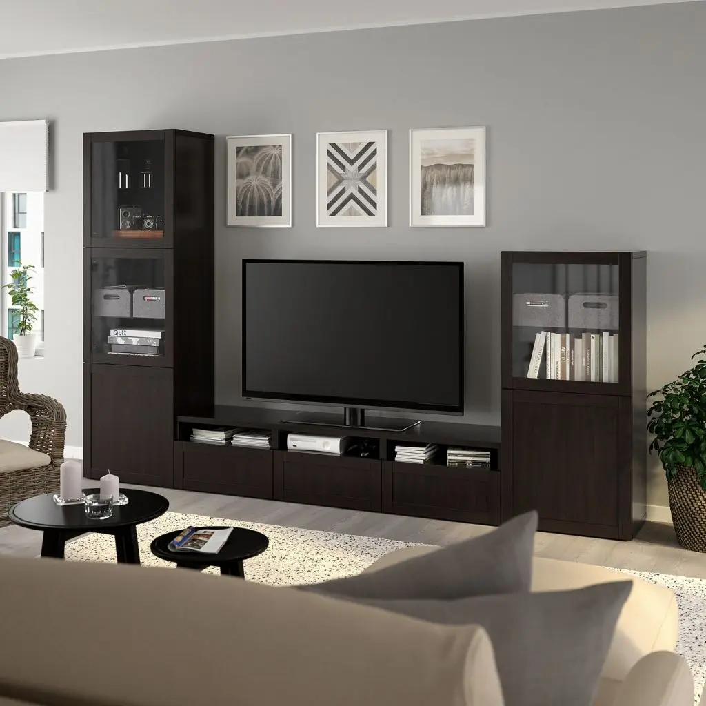 Благодаря доводчикам ящики закрываются плавно и бесшумно.Благодаря нескольким отверстиям на задней панели тумбы под ТВ провода от телевизора и других устройств всегда будут под рукой, но не на виду.Съемные полки позволяют регулировать пространство.Специальное отверстие в верхней панели обеспечит удобное и компактное размещение проводов.Эту мебель необходимо крепить к стене с помощью прилагаемого стенного крепежа.Макс. нагрузка на верхнюю панель этой тумбы под ТВ: 50 кг.Будьте осторожны при обращении с закаленным стеклом! Из-за поврежденных краев и царапин на поверхности стекло может внезапно разбиться.Для разных стен требуются различные крепежные приспособления. Подберите подходящие для ваших стен шурупы, дюбели, саморезы и т. п. (не прилагаются).Максимальная нагрузка на закрепленный на стене модуль зависит от материала стены.Внутренние элементы для организации хранения в модулях БЕСТО продаются отдельно.Если вы выберете функцию плавного закрывания, рекомендуем дополнить фасады ручками, чтобы открывать ящики/шкафы было удобнее.Дизайнер