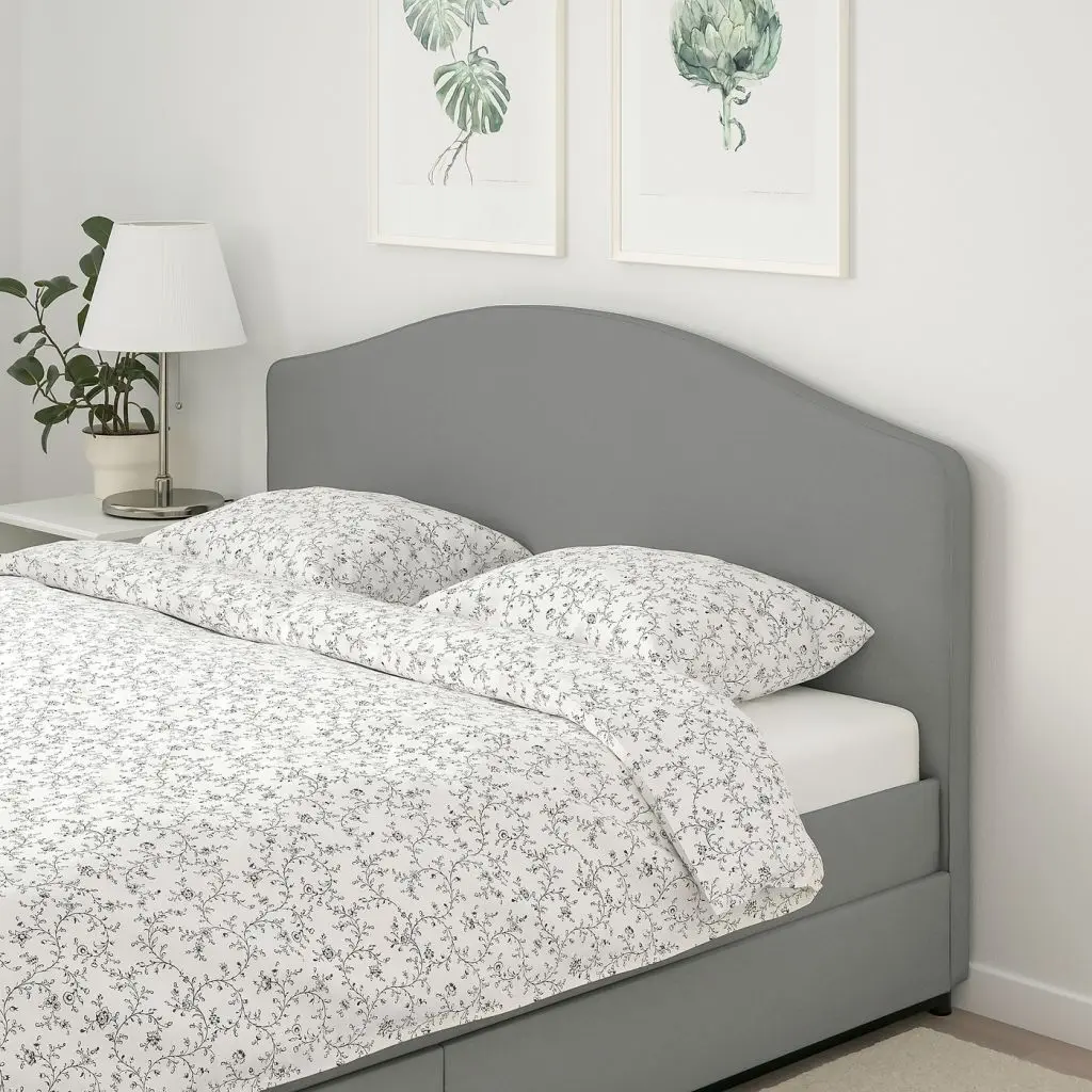 Благодаря колесикам ящики легко выдвигаются и задвигаются.На мягкое изголовье можно с комфортом опереться, когда вы смотрите телевизор или читаете в постели.Классический дизайн, мягкая обивка, плавные линии и окантовка по краю изголовья и изножья.Мягкая и приятная на ощупь ткань обивки ВИСЛЕ изготовлена из переработанного полиэстера.Реечное дно кровати и центральная перекладина прилагаются.4 ящика с обивкой прилагаются. Обратите внимание: ящики упакованы отдельно.Матрас и постельное белье продаются отдельно.Задняя сторона изголовья отделана нетканым материалом черного цвета.Износостойкость чехла подтверждена 50000 циклов воздействия истиранием. Способность выдержать 15000 циклов и более считается нормой для мебели для бытового использования. Показатель более 30000 циклов означает высокую устойчивость материала к истиранию.Чехол имеет уровень светостойкости (способность противостоять выцветанию) 5 по шкале от 1 до 8. В соответствии с отраслевыми стандартами материал с уровнем светостойкости 4 или выше подходит для домашнего использования.