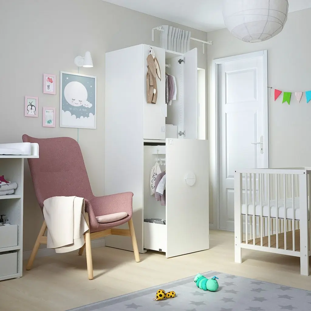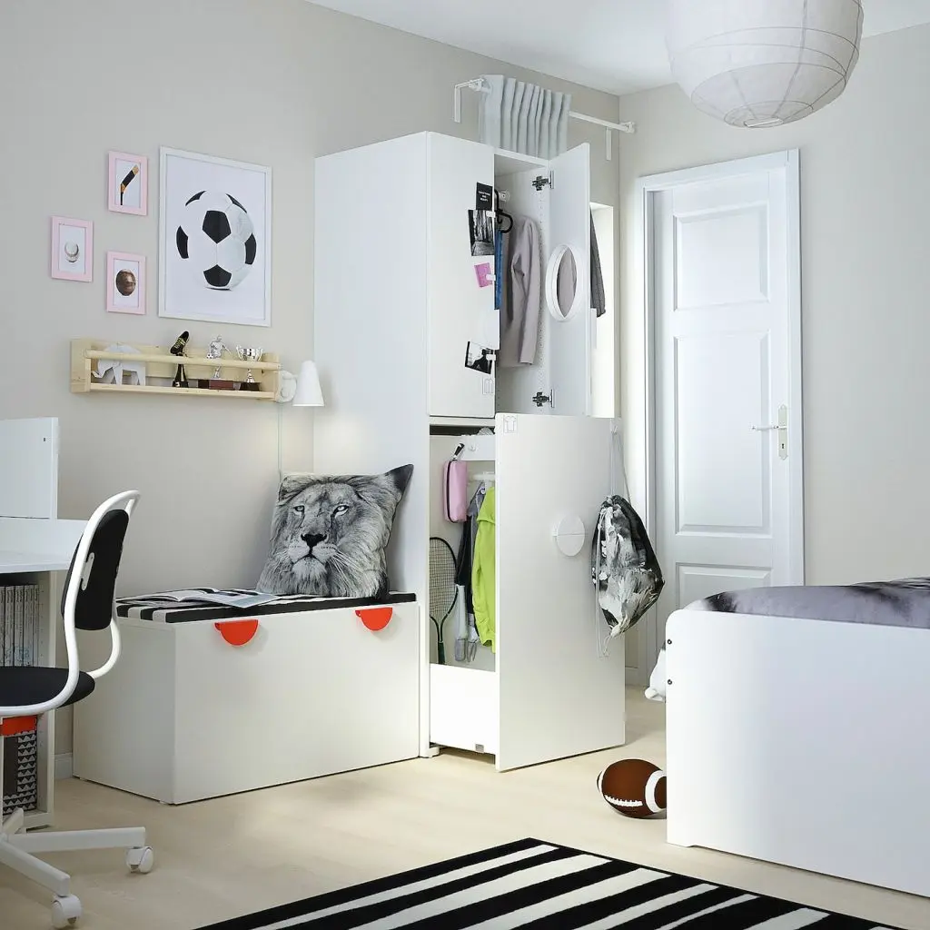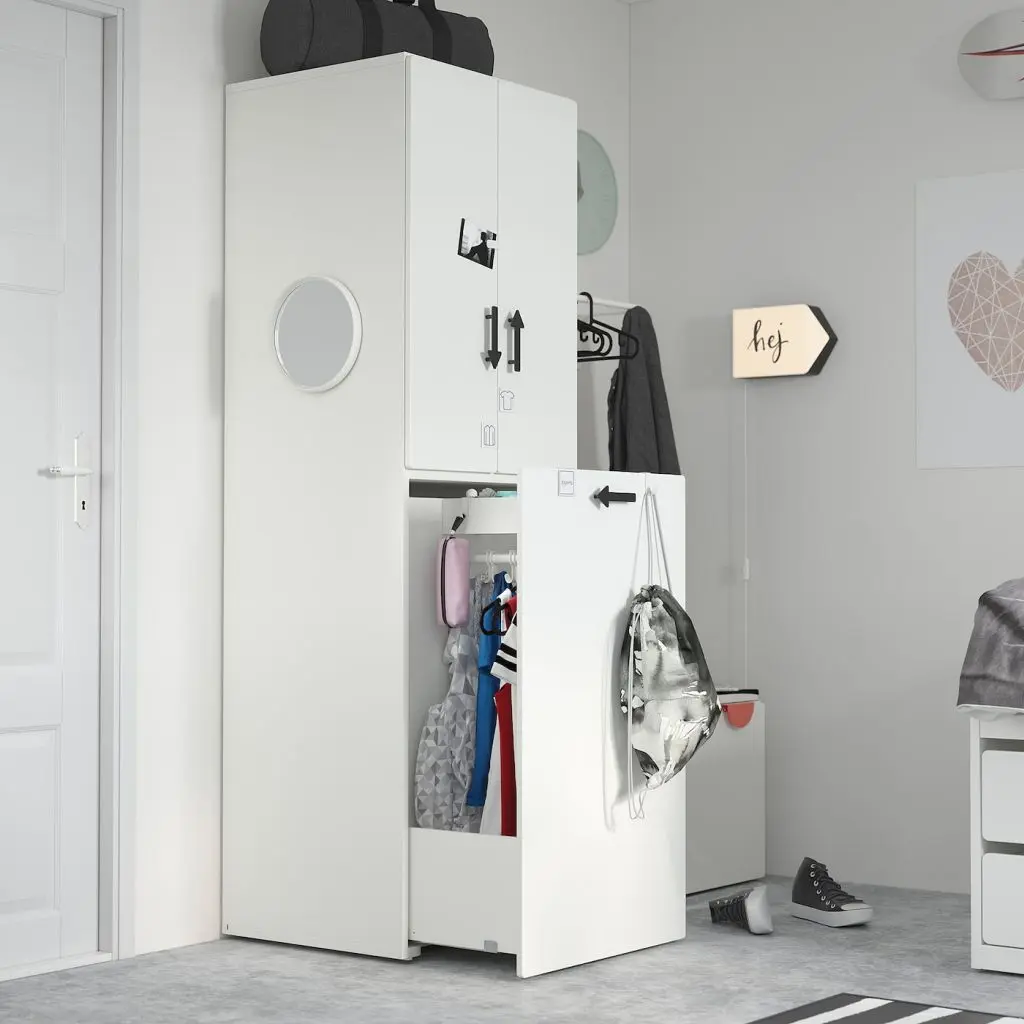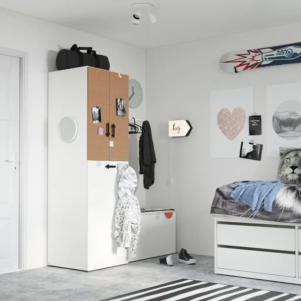 Ваш ребенок может повесить свои любимые рисунки и важные заметки на пробковые дверцы, и не придется сверлить лишние отверстия в стене.Для безопасности как детей, так и взрослых все дверцы системы СМОСТАД имеют скругленные углы.Благодаря крючкам изнутри и снаружи ребенку будет гораздо проще развешивать одежду, рюкзаки и другие вещи, которые обычно просто валяются на полу.В нижней части выдвижного модуля можно хранить все, что нужно быстро убирать с глаз долой.Двери, петли и платяная штанга прилагаются.2 крючка для платяной штанги ХЭЛПА и 4 крючка/зажима ЛЭТТХЕТ прилагаются.ВНИМАНИЕ! ОПАСНОСТЬ ОПРОКИДЫВАНИЯ! Незакрепленная мебель может опрокинуться. Эту мебель необходимо крепить к стене с помощью прилагаемого крепежа для предотвращения опрокидывания.Рекомендовано для детей от 6 лет.Для сборки этой мебели требуются два человека.Для разных стен требуются различные стенные крепления. Прилагающиеся шурупы пригодны для дерева, а дюбели можно использовать для гипсокартона/штукатурки, бетона или кирпичной кладки. Руководствуйтесь инструкциями по работе с материалом ваших стен.Для организации внутреннего пространства дополните аксессуарами ХЭНГИГ, полками и проволочными корзинами ХЭЛПА и коробками УППРЮМД. Продаются отдельно.Ручки продаются отдельно.