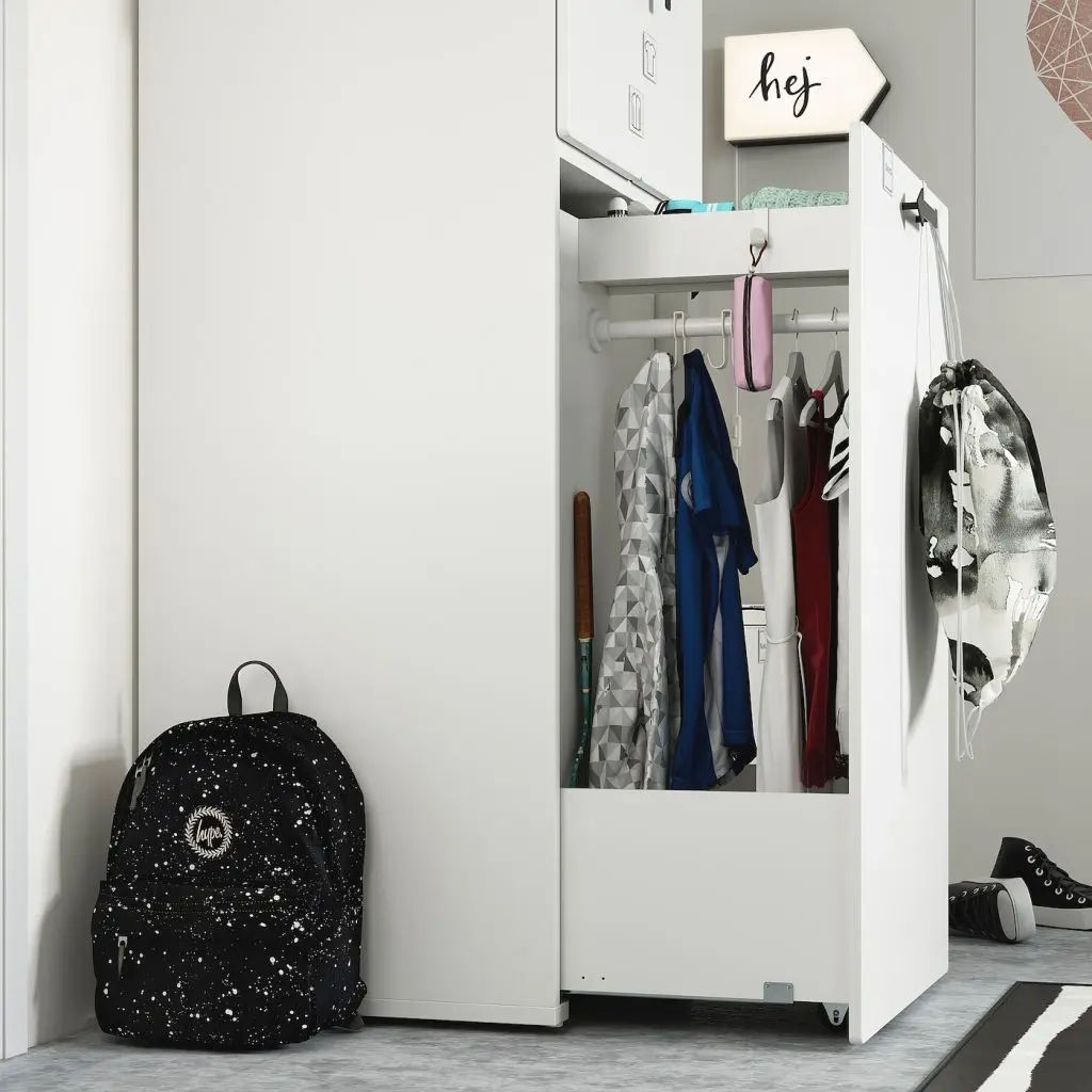 Этот гардероб с выдвижным модулем разрабатывался с учетом детского восприятия мира. В нем ребенок будет видеть всю свою одежду и сможет легко ее доставать с обеих сторон. Такое решение подойдет как самым маленьким, так и детям постарше.