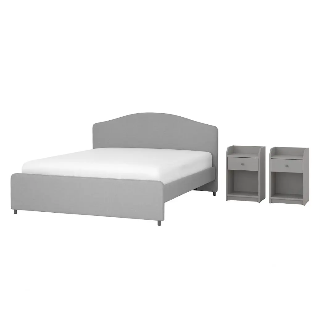 В комплект входит: 1 каркас кровати с обивкой с реечным дном и центральной перекладиной и 2 прикроватные тумбы.