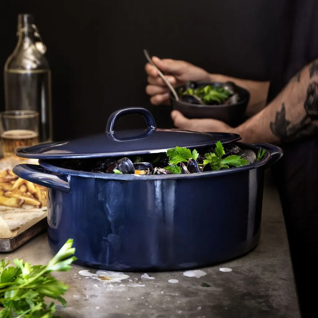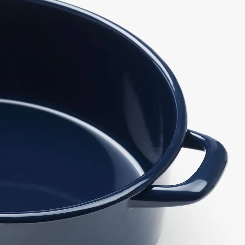 В этой эмалированной кастрюле в традиционном стиле приятно готовить на плите или в духовке, подавать блюдо на стол и удобно хранить «завтрашний» обед в холодильнике.