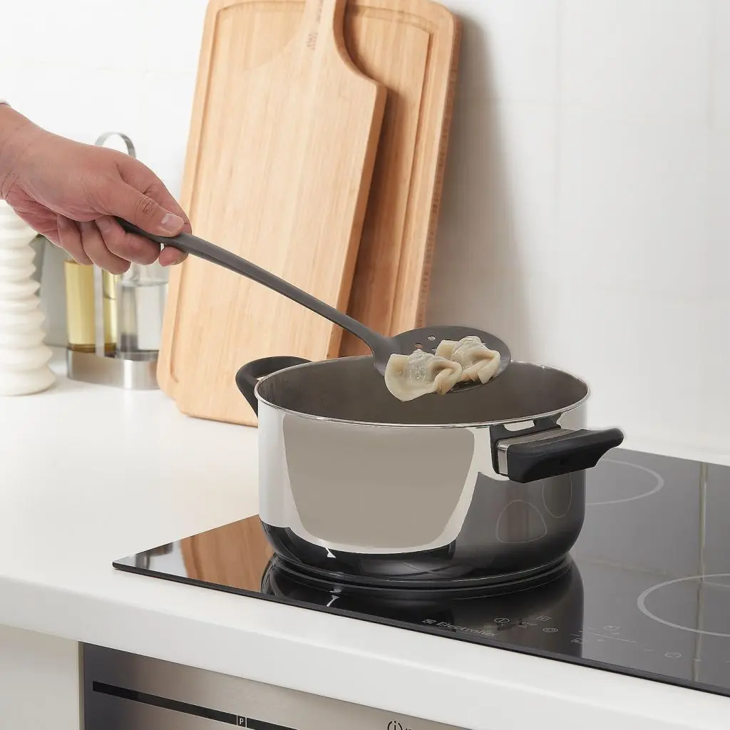 Не повреждает антипригарное покрытие кастрюль и сковородок.Вымойте изделие перед первым использованием.