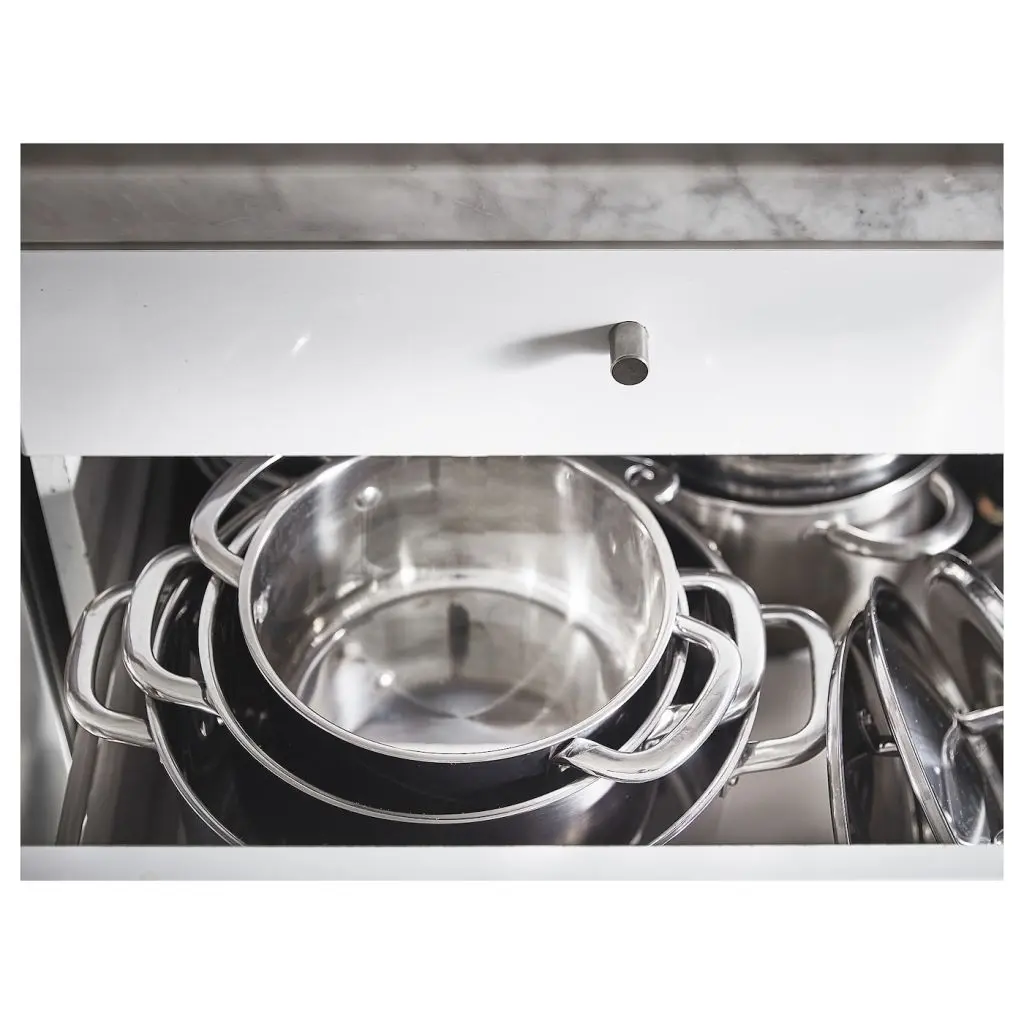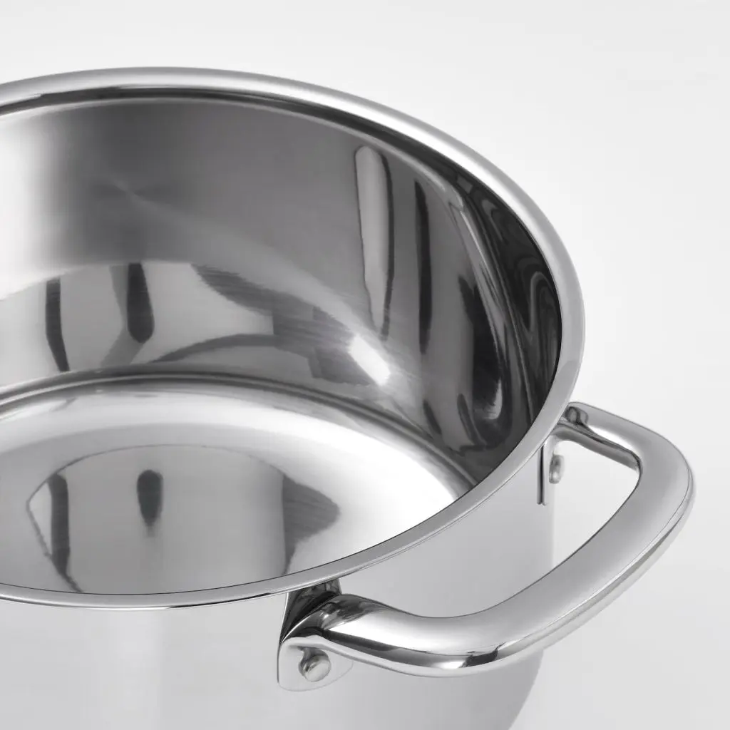 Подходит для всех типов варочных панелей, включая индукционную.Нержавеющая сталь — прочный и простой в уходе материал.Трехслойная конструкция дна: слой алюминия между двумя слоями нержавеющей стали. Обеспечивает равномерное нагревание, поэтому пища не пригорает и не прилипает к поверхности.Благодаря форме ручек маленькие кастрюли можно ставить в большие, что обеспечивает экономию места в кухонном шкафу.Кастрюля и ковши с крышками из нержавеющей стали. Крышка отражает тепло, поэтому содержимое быстро нагревается. Это позволяет экономить энергию.Посуда полностью изготовлена из металла, поэтому ее можно также использовать в духовке.Использование крышки обеспечивает быстрое закипание, что сокращает время приготовления и расход энергии.Благодаря отверстию для вентиляции давление снижается и содержимое не выкипает.Вы можете готовить при небольшом уровне нагрева и экономить энергию, так как нержавеющая сталь хорошо нагревается и долго удерживает тепло.Легко поднимать и переносить благодаря двум ручкам.Дизайнер
