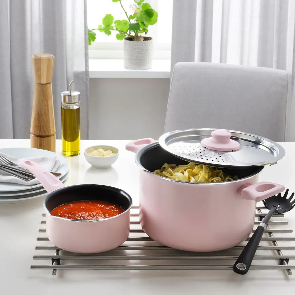 В набор входит: кастрюля с крышкой 3 л и 5 л, сотейник 1 л и и сковорода диам. 28 см.
