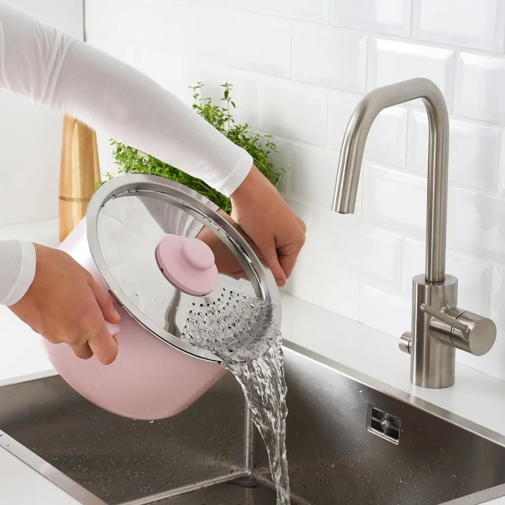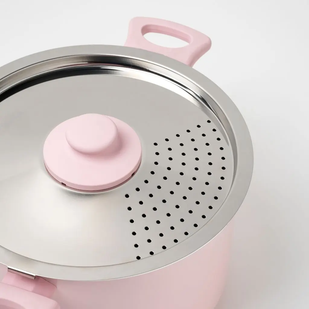 Крышка 5-литровой кастрюли оснащена специальной задвижкой. Это позволяет легко слить воду из кастрюли через отверстия в крышке.