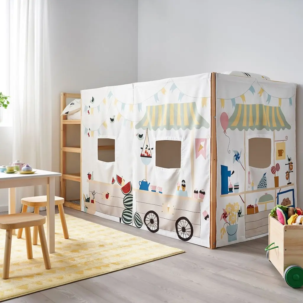 Гардину можно использовать независимо от того, как вы расположите кровать и с какой стороны будет лестница.У каждого «прилавка» есть окошко, поэтому дети могут играть как внутри, так и снаружи и по очереди выступать в роли продавца и покупателя.Игра в магазин и подражание взрослым — способ, через который дети получают опыт, учатся взаимодействовать с другими и понимать окружающих.Этот игровой модуль развивает воображение. Вместе с ним можно использовать игрушечную еду, игрушечную посуду и игрушечный кассовый аппарат серии ДУКТИГ.Вам не придется сверлить отверстия или использовать клей, чтобы закрепить гардину. Застежки-липучки крепятся к металлическим крючкам на кромке каркаса.На время уборки или перерыва в игре гардину можно отодвинуть в сторону, переместив металлические крючки.Гардина изготовлена из полиэстера — легкого, прочного и пропускающего воздух материала.Рекомендовано для детей от 3 лет.В набор входит: 2 шторы для длинной стороны кровати (115×84 см) и 1 штора для короткой стороны кровати (115×96 см).Подходит для двусторонней кровати КЮРА.Дизайнер