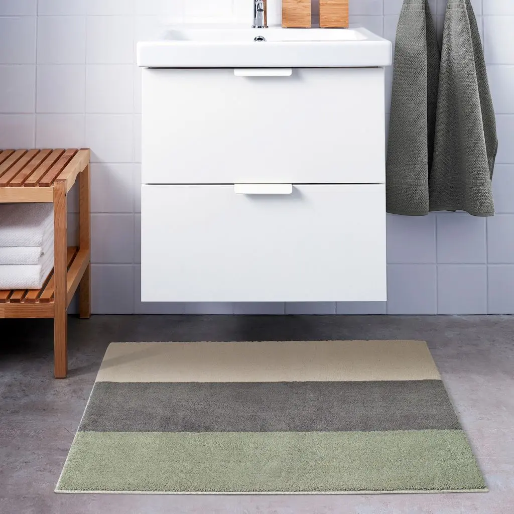 Большой коврик из мягкой микрофибры быстро сохнет и не скользит. Широкие полоски приглушенных цветов подойдут к интерьеру любого стиля и прекрасно сочетаются с полотенцами.