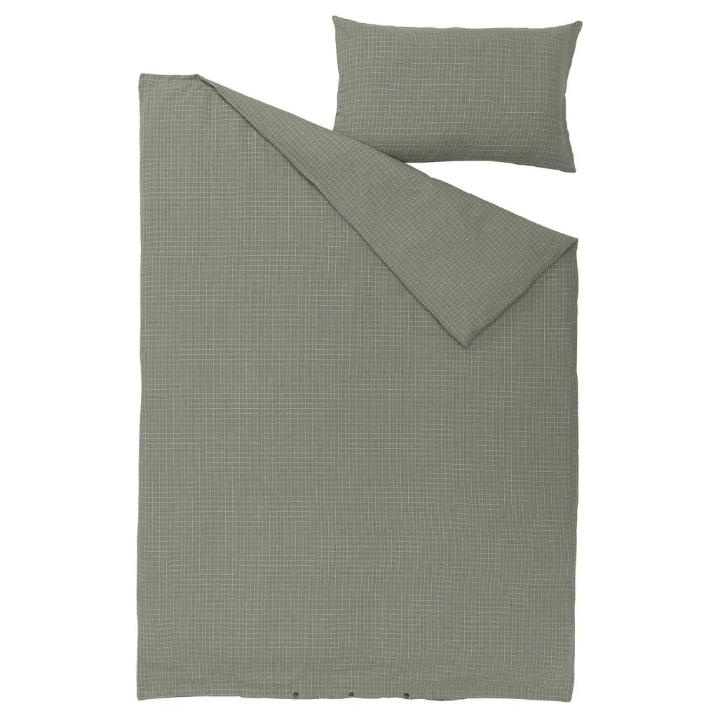 Ткань этого постельного белья с орнаментом в зелено-белую клетку из смеси хлопка и льна с каждой стиркой будет становиться мягче Отличный материал, если ночью вам часто бывает жарко.