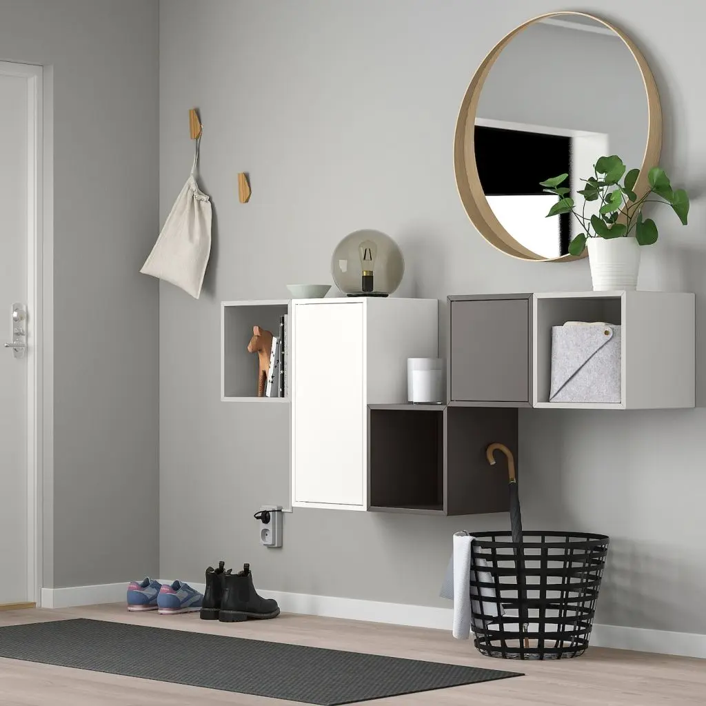 Комбинируйте открытое и закрытое хранение в зависимости от потребностей.Ассиметричное расположение секций подчеркнет индивидуальность решения для хранения.Дверца со встроенным нажимным механизмом открывается легким нажатием.Съемная полка позволяет регулировать внутреннее пространство в соответствии с потребностями хранения.Накладные шины ЭКЕТ для фиксации к стене прилагаются.Для разных стен требуются различные крепежные приспособления. Подберите подходящие для ваших стен шурупы, дюбели, саморезы и т. п. (не прилагаются).Максимальная нагрузка на подвесной шкаф зависит от материала стены.Дизайнер