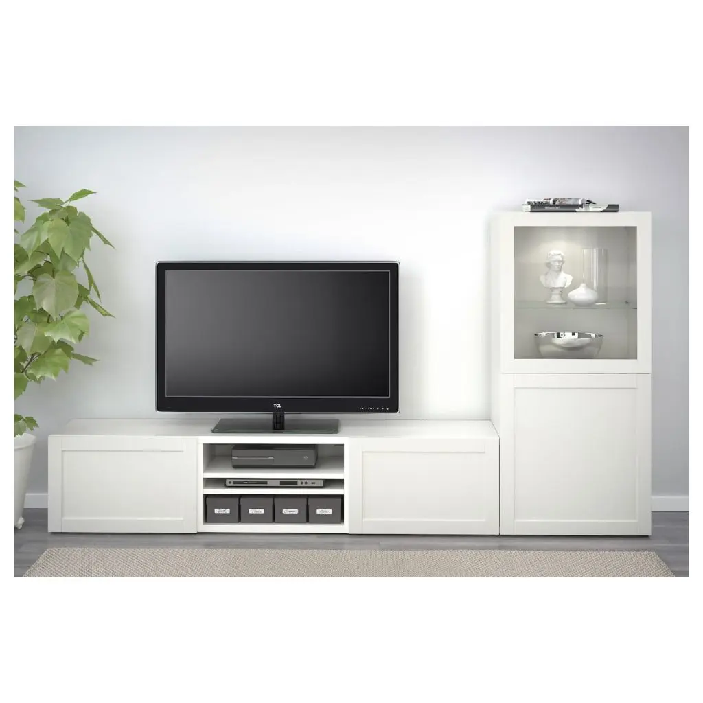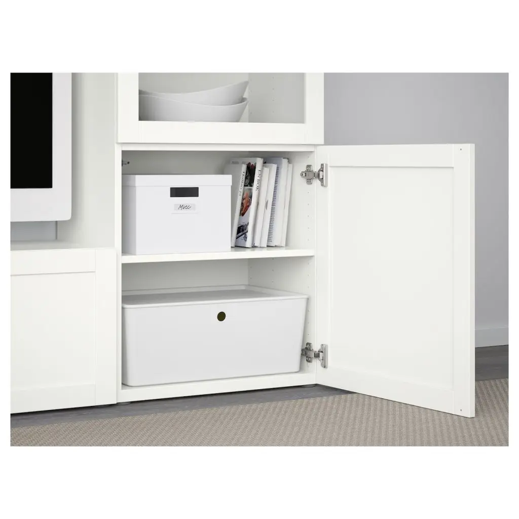 Благодаря доводчикам ящики закрываются плавно и бесшумно.Благодаря нескольким отверстиям на задней панели тумбы под ТВ провода от телевизора и других устройств всегда будут под рукой, но не на виду.Два ящика и полки за дверцами обеспечат достаточно места для хранения.Съемные полки позволяют регулировать пространство.Специальное отверстие в верхней панели обеспечит удобное и компактное размещение проводов.Эту мебель необходимо крепить к стене с помощью прилагаемого стенного крепежа.Будьте осторожны при обращении с закаленным стеклом! Из-за поврежденных краев и царапин на поверхности стекло может внезапно разбиться.Макс. нагрузка на верхнюю панель этой тумбы под ТВ: 50 кг.Для разных стен требуются различные крепежные приспособления. Подберите подходящие для ваших стен шурупы, дюбели, саморезы и т. п. (не прилагаются).Максимальная нагрузка на закрепленный на стене модуль зависит от материала стены.Внутренние элементы для организации хранения в модулях БЕСТО продаются отдельно.Если вы выберете функцию плавного закрывания, рекомендуем дополнить фасады ручками, чтобы открывать ящики/шкафы было удобнее.Дизайнер