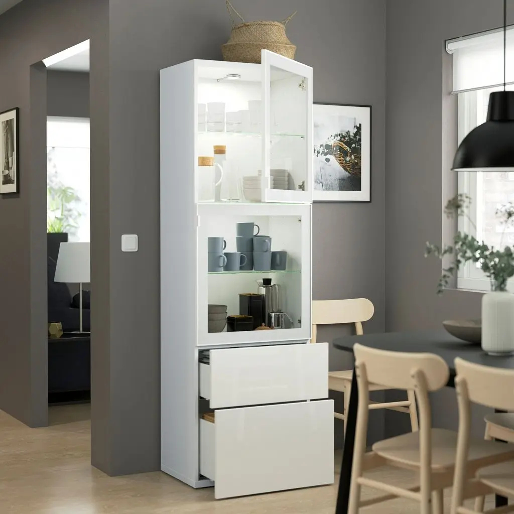 Ненужные вещи, которые часто валяются в беспорядке, можно спрятать, а любимые предметы выставить на всеобщее обозрение за стеклянными дверцами. Практичное решение для хранения и демонстрации любимых вещей с уникальным характером.
