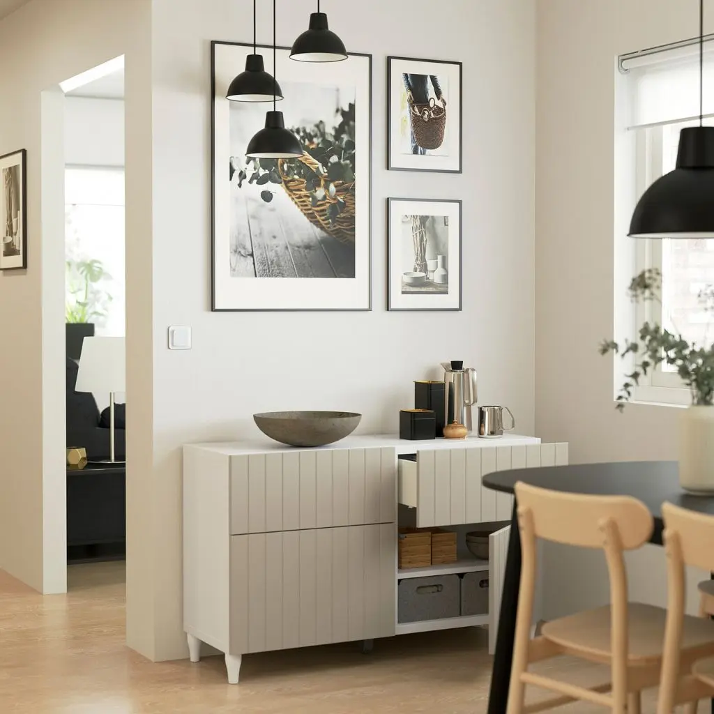 Конструкция петель позволяет отрегулировать и выровнять дверцу по вертикали и по горизонтали. Ящики со встроенным нажимным механизмом открываются легким нажатием.Съемные полки позволяют регулировать пространство.Два ящика и полки за дверцами обеспечат достаточно места для хранения.Организуйте и оптимизируйте систему для хранения БЕСТО, используя подходящие коробки и вставки.Эту мебель необходимо крепить к стене с помощью прилагаемого стенного крепежа.Для разных стен требуются различные крепежные приспособления. Подберите подходящие для ваших стен шурупы, дюбели, саморезы и т. п. (не прилагаются).Для функционирования нажимного механизма необходимо пространство между каркасом и фронтальной панелью ящика, чтобы ящик открывался нажатием. Небольшой зазор необходим для обеспечения этой функции и не является недостатком товара.