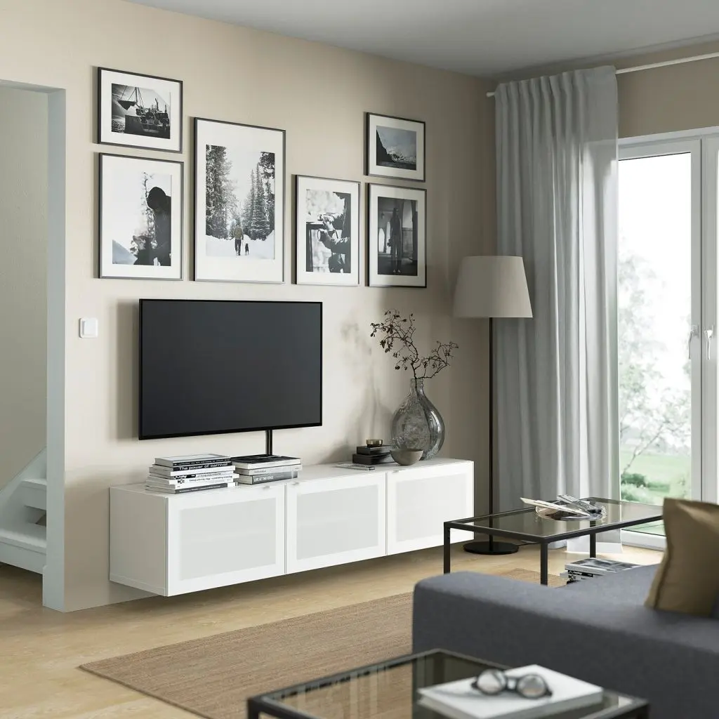 Сетчатые металлические дверцы пропускают сигнал от пульта, поэтому за ними можно разместить электронное оборудование.Чтобы подчеркнуть современный и лаконичный стиль интерьера, тумбу под ТВ БЕСТО можно закрепить на стене. Дополнительный плюс — ножки не будут мешать уборке.Благодаря нескольким отверстиям на задней панели тумбы под ТВ провода от телевизора и других устройств всегда будут под рукой, но не на виду.Специальное отверстие в верхней панели обеспечит удобное и компактное размещение проводов.Съемные полки позволяют регулировать пространство.Вы можете использовать нажимной механизм или устройство для плавного закрывания. В первом варианте для открывания дверцы достаточно слегка нажать на нее. А во втором – гарантировано плавное и бесшумное закрывание.Организуйте и оптимизируйте систему для хранения БЕСТО, используя подходящие коробки и вставки.Мы рекомендуем, чтобы тумба была немного шире, чем установленный на ней телевизор. Эта тумба подходит для телевизора до 72 дюймов. Вы можете выбрать телевизор большего размера, если он не тяжелее указанной максимальной нагрузки на верхнюю панель тумбы.Верхняя панель этой тумбы предназначена для телевизора весом макс. 50 кг.Максимальная нагрузка на закрепленный на стене модуль зависит от материала стены.Для разных стен требуются различные крепежные приспособления. Подберите подходящие для ваших стен шурупы, дюбели, саморезы и т. п. (не прилагаются).Стоящая на полу тумба под ТВ должна быть закреплена к стене с помощью прилагающего стенного крепежа.Ручка прилагается.