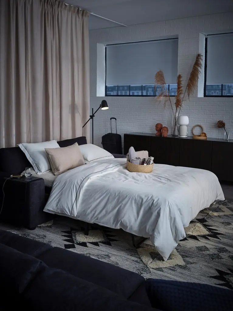 Секции ВИМЛЕ можно по-разному комбинировать, чтобы создать диван, максимально соответствующий вашим потребностям и возможностям помещения. В этой комбинации есть диван-кровать с комфортным высоким матрасом.