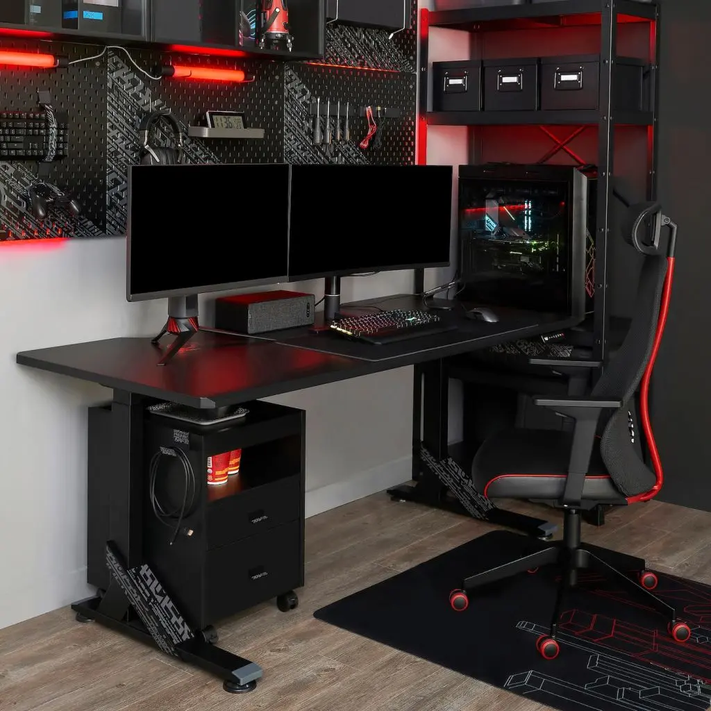 Как вы привыкли играть — сидя или стоя? Этот стол можно установить на одном из 4 уровней и легко менять высоту одним нажатием кнопки.С помощью электропривода высоту подстолья можно регулировать в диапазоне от 72 до 120 см, чтобы при желании чередовать работу сидя и стоя.Эту столешницу можно расположить по-разному. Если установить ее вырезом вперед, игрок сможет сидеть с максимальным комфортом, удобно расположив руки. А если развернуть столешницу другой стороной, вырез обеспечит место для организации проводов.Износостойкая матовая поверхность столешницы комфортна для глаз, так как не бликует под воздействием освещения.Даже играть важно с комфортом, особенно если игра затянулась. Глубокая столешница позволяет установить мониторы на удобном для глаз расстоянии.Подголовник можно поворачивать и регулировать по высоте, чтобы обеспечить хорошую опору для шеи на время игры или в перерывах.Подлокотники двигаются синхронно с вами, и их можно регулировать по высоте, чтобы максимально снизить нагрузку с рук и плеч.Сетчатый материал спинки пропускает воздух, что особенно важно, когда страсти накаляются.Колесики оснащены тормозом безопасности, реагирующим на изменение давления: они разблокируются только под воздействием веса сидящего человека.Сиденье и спинка синхронно качаются, повторяя ваши движения, чтобы вам было удобно независимо от положения тела.Прочную обивку под кожу легко чистить: достаточно протирать.Функция регулировки и фиксации наклона обеспечивает устойчивость и максимальный комфорт.Благодаря бортику по краю верхней панели вещи не будут падать. Поставьте на нее закуски, чтобы быстро зарядиться энергией перед очередной игрой.Ящики со встроенным стопором закрываются медленно, плавно и бесшумно.В верхнем выдвижном ящике можно хранить мелкие вещи, а в самом большом нижнем ящике — вещи, которые всегда должны быть под рукой.Сбоку есть крючок, на который можно повесить провода или наушники, чтобы они всегда были под рукой.Отверстие в верхней части тумбы и специальные отверстия сзади позволят аккуратно организовать провода.Благодаря колесикам со стопором тумба не будет смещаться.Тумбу можно легко закатить под стол, чтобы освободить место.