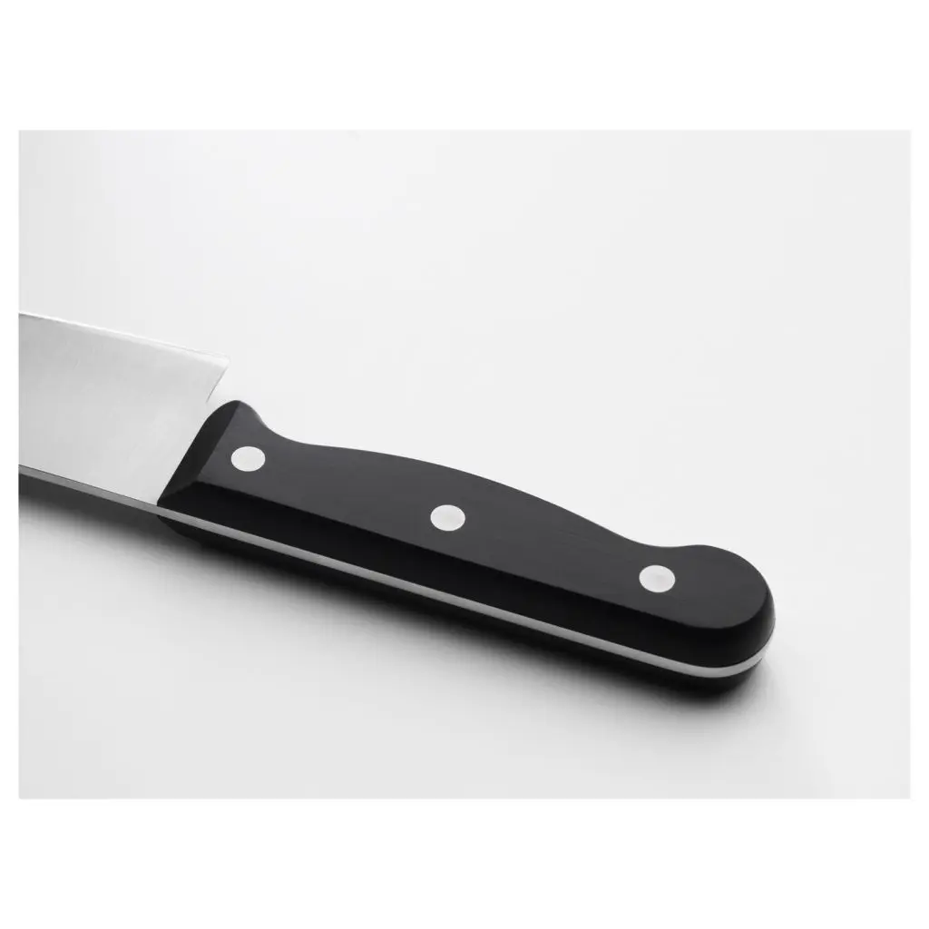 Прочное лезвие – легко резать мясо и корнеплоды.Нож из нержавеющей молибден-ванадиевой стали долго остается острым.Хвостовик ножа проходит по всей длине ручки, делая ее прочной и обеспечивая ножу хороший баланс.Вымойте изделие перед первым использованием.Дизайнер