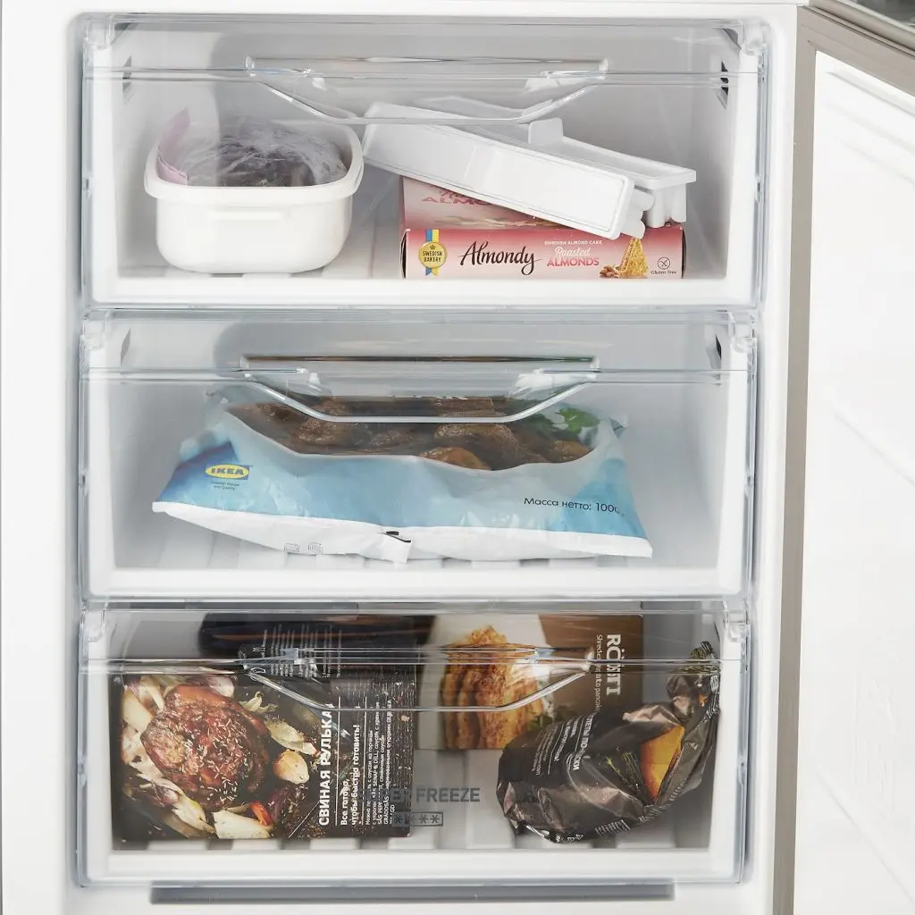 Бесплатно 2 года гарантии. Подробнее об условиях гарантии – в гарантийной брошюре.Организуйте пространство для хранения в соответствии с вашими потребностями, используя 3 съемные полки.Светодиодная подсветка, как правило, прослужит весь срок эксплуатации холодильника/морозильника.Не требует разморозки. Функция «no frost» автоматически регулирует уровень влажности, что предотвращает образование инея.Расход энергии: 323 кВт*ч в год.Уровень шума: 43 дБ(А).Напряжение: 220-240 В.Не требующее обслуживания светодиодное освещение (LED).Система разморозки: Автоматическая.4 съемные полки из закаленного стекла прилагаются.1 контейнер прилагается.1 лоток для яиц прилагается.3 морозильных ящика прилагаются.2 лотка для кубиков льда прилагаются.Дизайнер
