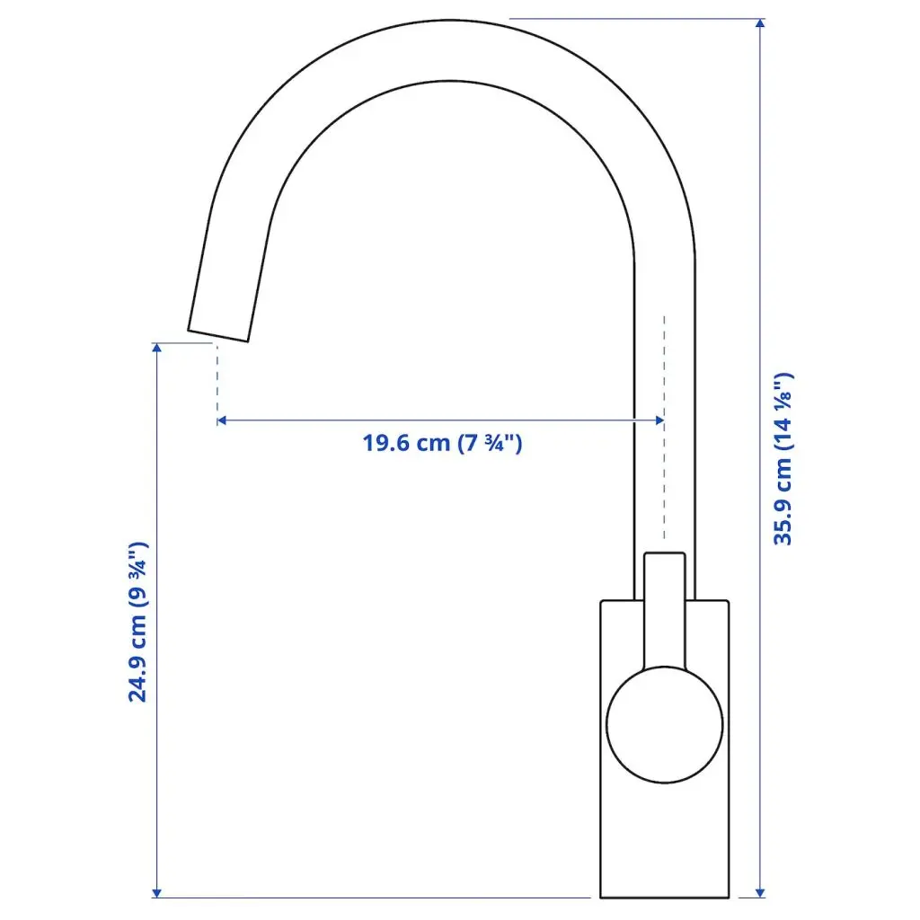 Бесплатно 10 лет гарантии. Подробнее об условиях гарантии — в гарантийной брошюре.Интегрированный аэратор поддерживает оптимальный напор, при этом используется меньше воды и энергии.Высокий носик удобен для мытья больших кастрюль и т.п.Прочные керамические диски картриджа выдерживают сильное трение, возникающее в процессе изменения температуры воды.Протестировано и одобрено в соответствии с техническими стандартами, а также стандартами качества и безопасности.Этот смеситель предназначен для водопроводных систем с высоким давлением. Протестирован для работы с давлением макс. 10 бар (1000 кПа). Рекомендуемое рабочее давление: 1,0–5,0 бар (100 кПа – 500 кПа).Если у вас возникли сомнения по поводу установки, обратитесь к специалисту.Устанавливается в отверстие 35 мм. Макс. толщина мойки/столешницы 50 мм.Инструмент для установки смесителя прилагается.Соединительные шланги на 1/2″ прилагаются. Длина: 50 см. Экономящий воду и энергию (5,7 л/мин.) аэратор для систем с высоким давлением прилагается.Чтобы продлить срок службы товара, некоторые его детали можно заменить. Подробнее — в отделе ИКЕА Сервис или на сайте IKEA.ru.Максимальная температура подключения горячей воды: 80 °C/176 °F. Рекомендованная температура: 65 °C/149 °F.Угол поворота носика установлен на 360°, но может быть установлен 120°.Дизайнер