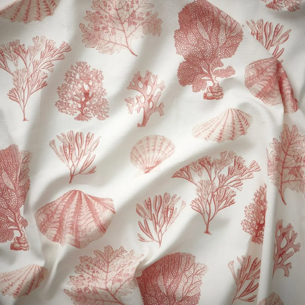 Хлопковая ткань с орнаментом из кораллов, раковин и водорослей. Отлично подходит для пошива гардин, скатертей или чехлов на подушку, чтобы задать морскую тему в оформлении интерьера.