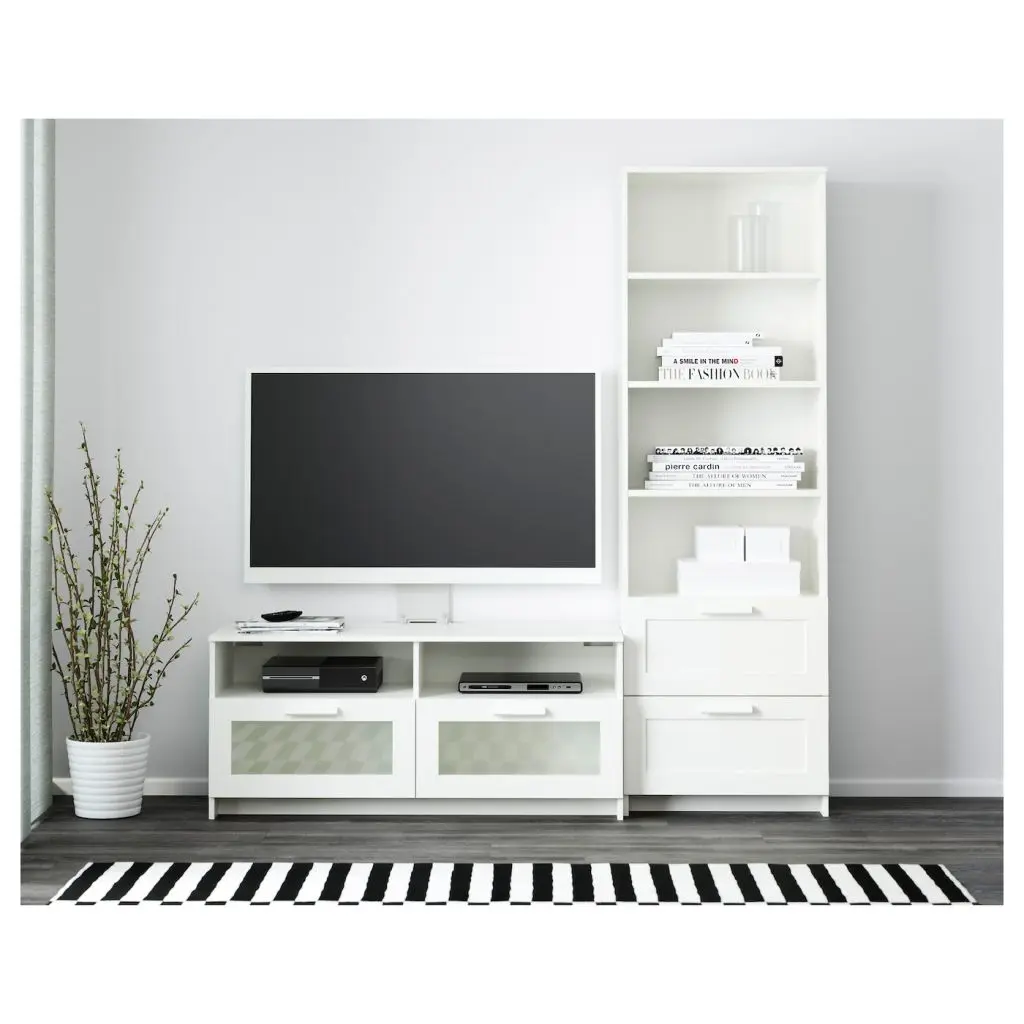 Эта комбинация предоставит место для размещения телевизора. Кроме того, вещи которые вы хотели бы продемонстрировать займут место на открытых регулируемых по высоте полках.Съемные полки позволяют регулировать внутреннее пространство в соответствии с потребностями хранения.Отверстия для проводов на задней панели. Провода не на виду, но всегда под рукой.Ящики с плавным ходом и стопором.Эту мебель необходимо крепить к стене с помощью прилагаемого стенного крепежа.Будьте осторожны при обращении со стеклом! Из-за поврежденных краев и царапин на поверхности стекло может внезапно треснуть и/или разбиться. Избегайте ударов сбоку, там стекло наиболее уязвимо.Для разных стен требуются различные крепежные приспособления. Подберите подходящие для ваших стен шурупы, дюбели, саморезы и т. п. (не прилагаются).Комбинируется с другой мебелью серии БРИМНЭС.Дизайнер