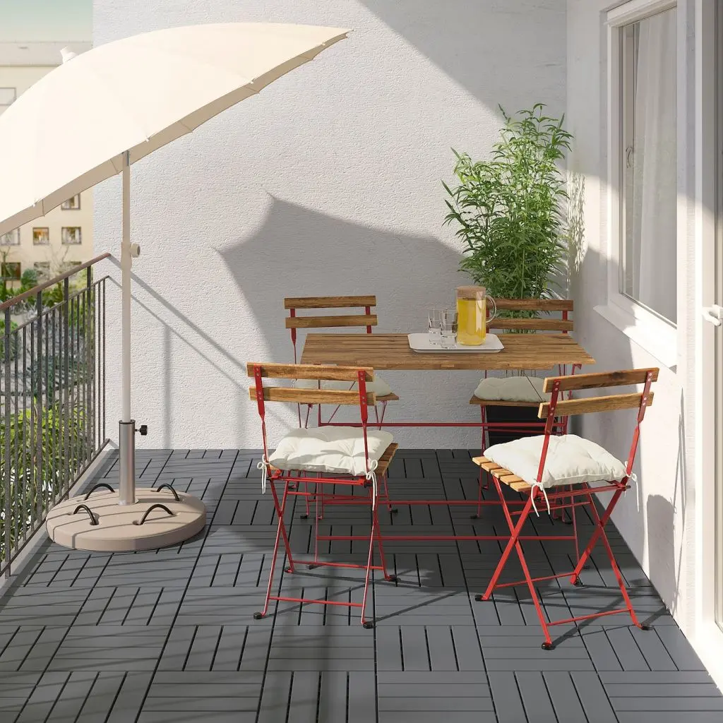 Мебель обработана полупрозрачной морилкой. Это повышает ее прочность и подчеркивает выразительность натуральной фактуры дерева.Стол и стулья складываются для компактного хранения.Расцветка чехла на подушку сохранит свежесть надолго, так как ткань устойчива к выцветанию.Чтобы продлить срок службы подушки, ее можно регулярно переворачивать.Завязки фиксируют подушку на стуле.Рекомендовано для использования на улице.Можно убирать на хранение в мешок или сундук серии ТОСТЕРО.Можно дополнить чехлом ТОСТЕРО для комплекта мебели 145×145 см.Можно дополнить подушкой на стул КУДДАРНА (32×36 см), ФРЁСЁН/ДУВХОЛЬМЕН (диам. 35 см), ИТТЕРОН или БРЭМОН.Для повторной обработки используйте морилку, продается отдельно.4 подушки на стул прилагаются.