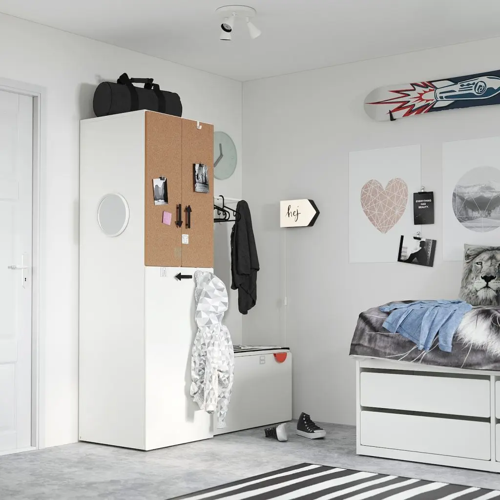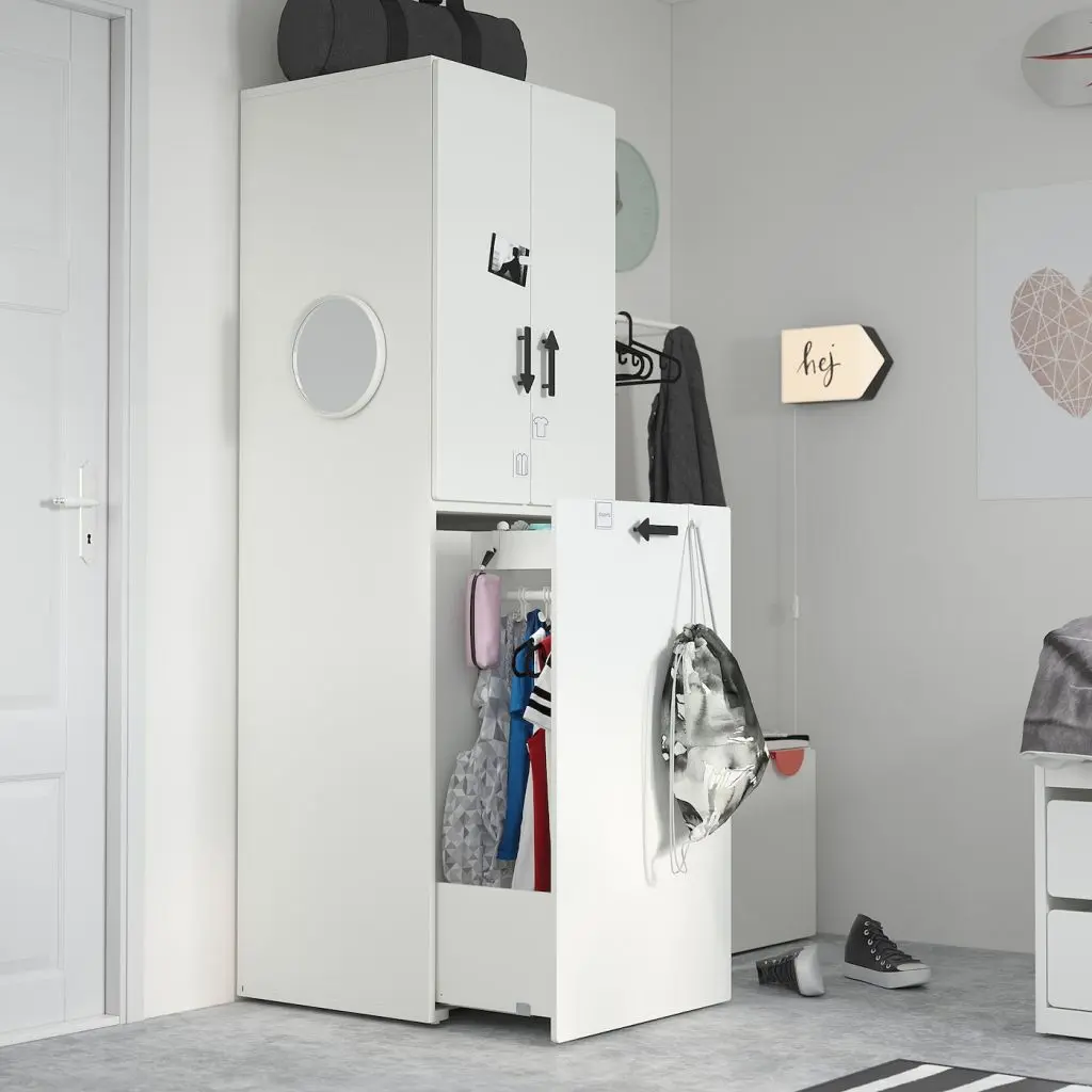 Для безопасности как детей, так и взрослых все дверцы системы СМОСТАД имеют скругленные углы.Благодаря крючкам изнутри и снаружи ребенку будет гораздо проще развешивать одежду, рюкзаки и другие вещи, которые обычно просто валяются на полу.В нижней части выдвижного модуля можно хранить все, что нужно быстро убирать с глаз долой.Двери, петли и платяная штанга прилагаются.2 крючка для платяной штанги ХЭЛПА и 4 крючка/зажима ЛЭТТХЕТ прилагаются.ВНИМАНИЕ! ОПАСНОСТЬ ОПРОКИДЫВАНИЯ! Незакрепленная мебель может опрокинуться. Эту мебель необходимо крепить к стене с помощью прилагаемого крепежа для предотвращения опрокидывания.Для сборки этой мебели требуются два человека.Для разных стен требуются различные стенные крепления. Прилагающиеся шурупы пригодны для дерева, а дюбели можно использовать для гипсокартона/штукатурки, бетона или кирпичной кладки. Руководствуйтесь инструкциями по работе с материалом ваших стен.Для организации внутреннего простраства дополните аксессуарами ХЭНГИГ, полками и пролочными корзинами ХЭЛПА и коробками УППРЮМД. Продаются отдельно.Ручки продаются отдельно.