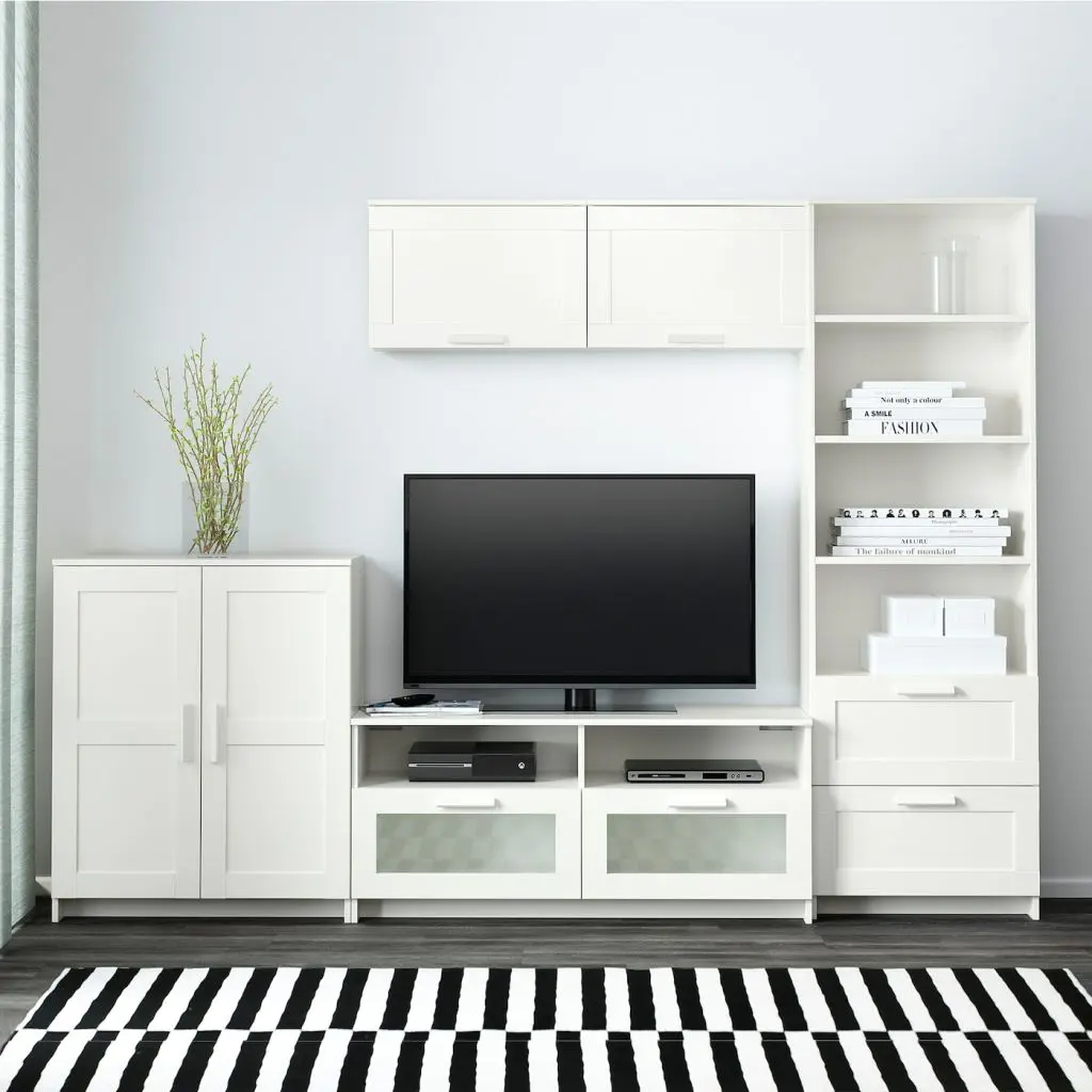 Эта комбинация для ТВ предоставит достаточно места для хранения, чтоб в вашей гостиной царил идеальный порядок.Глухие дверцы защитят содержимое от пыли.Отверстия для проводов на задней панели. Провода не на виду, но всегда под рукой.Ящики с плавным ходом и стопором.Эту мебель необходимо крепить к стене с помощью прилагаемого стенного крепежа.Для разных стен требуются различные крепежные приспособления. Подберите подходящие для ваших стен шурупы, дюбели, саморезы и т. п. (не прилагаются).Комбинируется с другой мебелью серии БРИМНЭС.Дизайнер