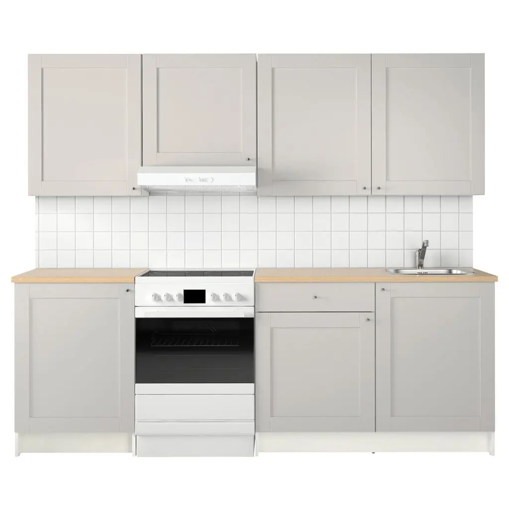 Вы можете выбрать готовую комбинацию или создать индивидуальное решение, комбинируя модули КНОКСХУЛЬТ.Отличное бюджетное решение для кухни среднего размера с отдельно стоящей плитой.Удобно хранить кухонную и столовую посуду, так как в комбинации есть модули с ящиками и полками.Пространство стены используется эффективно благодаря дополнительному месту для хранения в шкафу над вытяжкой.Выберите отдельно стоящую плиту и встраиваемую вытяжку и дополните мебель понравившимися ручками, чтобы придать решению более индивидуальный вид.Меламиновая поверхность фасадов и каркасов проста в уходе и устойчива к появлению царапин.Устойчивая к воздействию влаги, тепла и появлению царапин ламинированная столешница проста в уходе.Дверцы легко установить благодаря регулируемым по высоте, глубине и ширине петлям.Дверцы можно установить справа или слева.Регулируемые ножки обеспечивают устойчивость даже на неровном полу.Включено: шкаф, дверцы, ящики, столешница, ножки, цоколь, полки, петли и крепления.Ручки продаются отдельно.Бытовая техника продается отдельно.Кухонный смеситель продается отдельно.Для разных стен требуются различные крепежные приспособления. Подберите подходящие для ваших стен шурупы, дюбели, саморезы и т. п. (не прилагаются).Чтобы сохранить ламинированную столешницу, никогда не режьте непосредственно на ее поверхности, пользуйтесь разделочной доской. Предметы с острыми краями могут повредить поверхность.Можно дополнить ковриком для ящика и поддонами, чтобы защитить поверхность от царапин, которые могут оставить тяжелые сковороды и кастрюли.