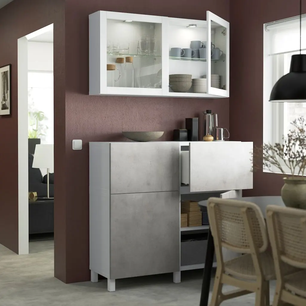 Благодаря слегка текстурированной поверхности фасад КЭЛЛЬВИКЕН напоминает бетон.Стеклянные дверцы позволяют продемонстрировать содержимое шкафа, защищая его от пыли.Ящики со встроенным нажимным механизмом открываются легким нажатием.Конструкция петель позволяет отрегулировать и выровнять дверцу по вертикали и по горизонтали. Съемные полки позволяют регулировать пространство.Компактные навесные шкафы позволяют эффективно задействовать стену под хранение вещей.Два ящика и полки за дверцами обеспечат достаточно места для хранения.Организуйте и оптимизируйте систему для хранения БЕСТО, используя подходящие коробки и вставки.Эту мебель необходимо крепить к стене с помощью прилагаемого стенного крепежа.Будьте осторожны при обращении с закаленным стеклом! Из-за поврежденных краев и царапин на поверхности стекло может внезапно разбиться.Для разных стен требуются различные крепежные приспособления. Подберите подходящие для ваших стен шурупы, дюбели, саморезы и т. п. (не прилагаются).Для функционирования нажимного механизма необходимо пространство между каркасом и фронтальной панелью ящика, чтобы ящик открывался нажатием. Небольшой зазор необходим для обеспечения этой функции и не является недостатком товара.