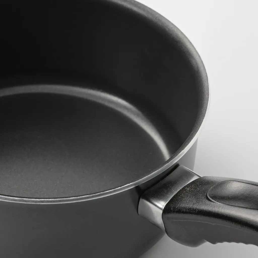 Благодаря небольшому весу посуду легко поднять даже с пищей.Сделано из алюминия. Этот материал равномерно распределяет тепло и быстро реагирует на изменение температуры, поэтому пища не пригорает и не прилипает к поверхности.Прочное антипригарное покрытие Teflon® Classic облегчает использование и уход.Размеры: кастрюли на 1 л, 1,5 л и 2 л.Вымойте изделие перед первым использованием.Дизайнер