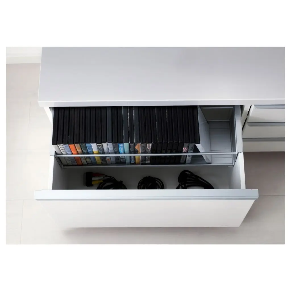 Два вместительных ящика обеспечат достаточно места для видеоигр и других аксессуаров.Вставку можно вынуть из ящика.Ручки прилагаются.Эту мебель необходимо крепить к стене с помощью прилагаемого стенного крепежа.Дизайнер