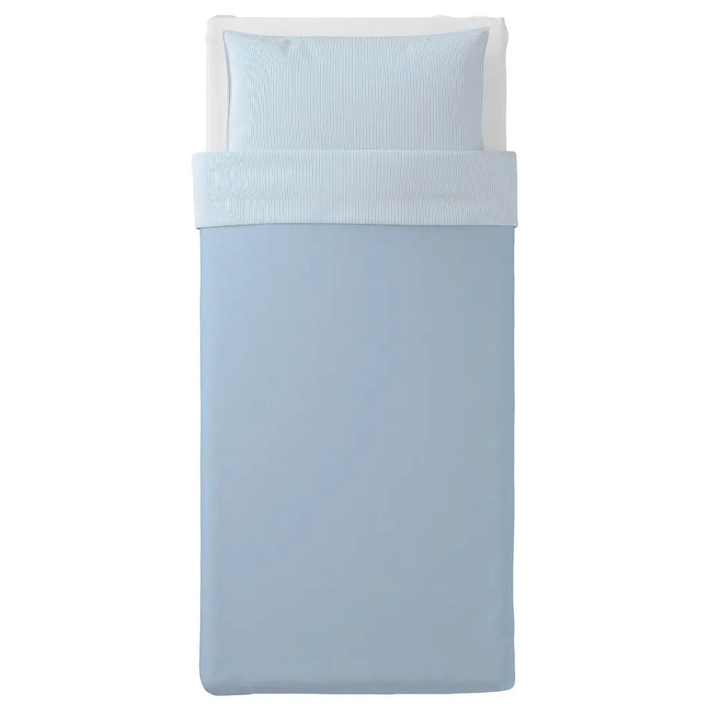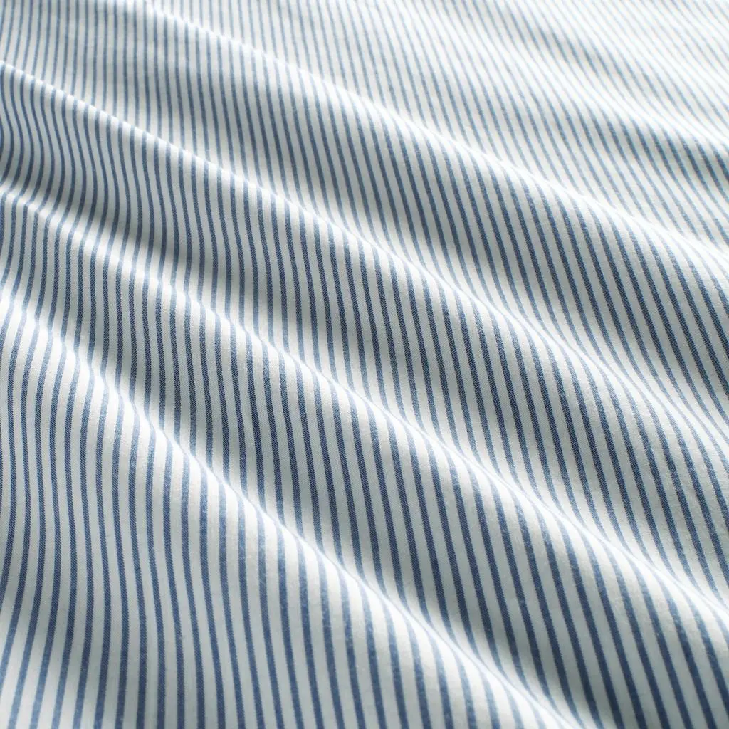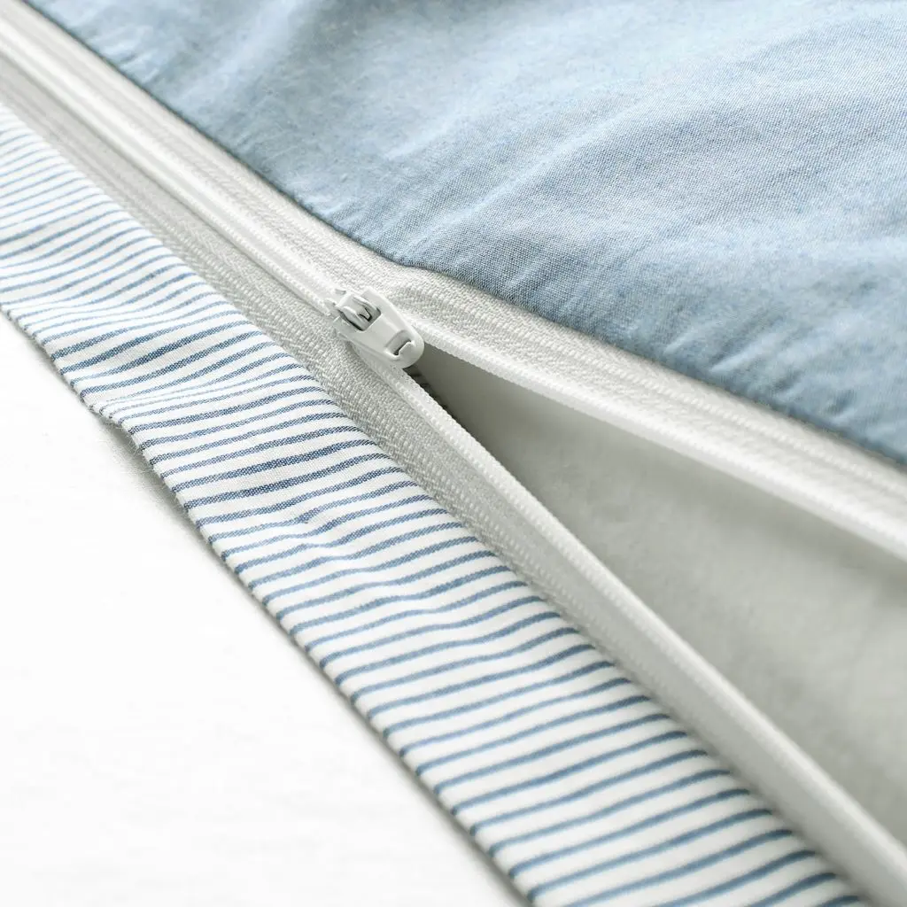 Прохладное свежее постельное белье из мягкого плотного хлопка. С одной стороны ткань шамбре, с другой — орнамент в полоску. Благодаря молнии одеяло не будет выбиваться.