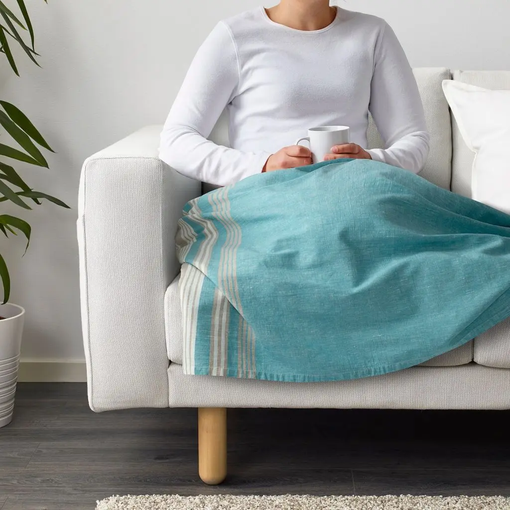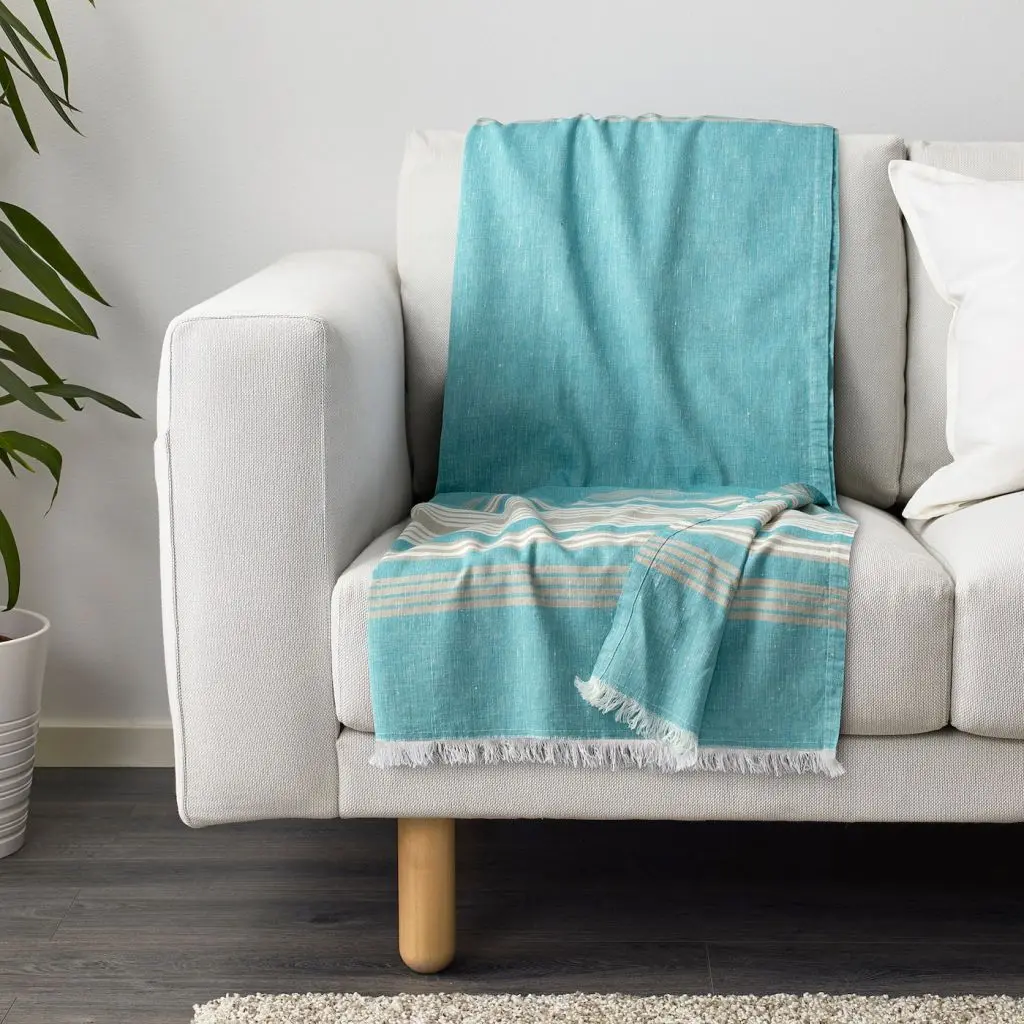 Можно стирать в машине.Можно уютно укутаться лежа на диване или накинуть на себя, когда прохладно.Естественные вариации натурального цвета неокрашенных и неотбеленных хлопка и льна делают каждый плед уникальным.Есть разные цвета.Дизайнер