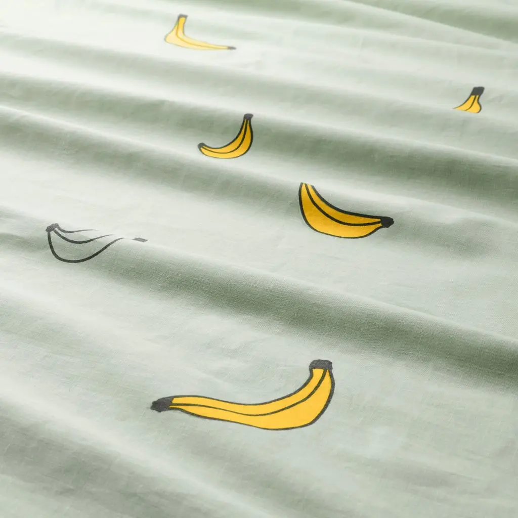 Симпатичное постельное белье с орнаментом из бананов на светло-зеленом фоне. Ткань изготовлена и смести хлопка и вискозы и поддерживает ровную приятную температуру в постели, чтобы ваш ребенок просыпался хорошо отдохнувшим.