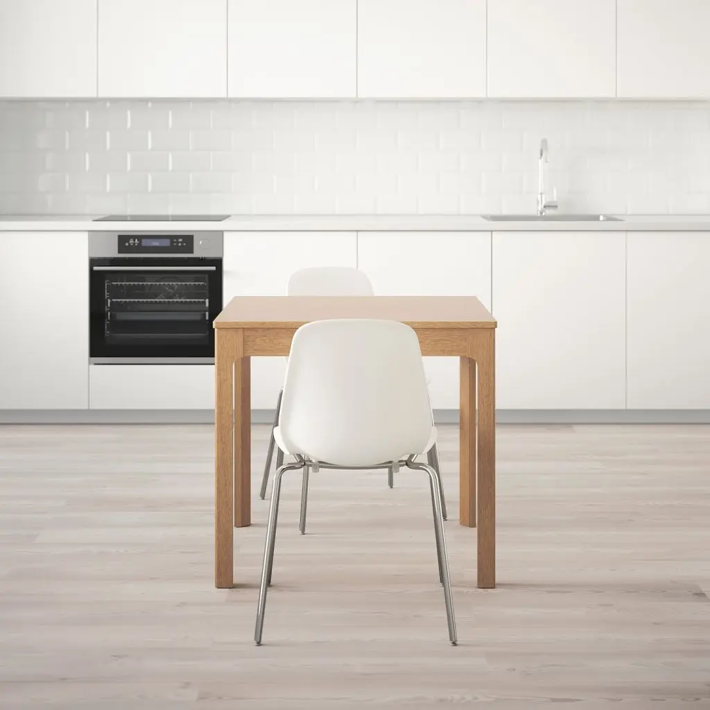 Каждый стол уникален – благодаря естественному рисунку натуральной древесины и вариативности ее оттенков.1 человек может легко и быстро разложить стол перед приходом гостей.Когда стол не разложен, на поверхности столешницы нет никаких швов.Вкладную доску удобно хранить под столешницей.Ножки всегда находятся по углам стола, даже когда он раздвинут, что обеспечивает достаточно места для стульев.Можно дополнить стульями и скамьями этой серии или другими стульями из ассортимента ИКЕА.На 2-4 человека.1 вкладная доска прилагается.Для обеспечения устойчивости через две недели после сборки еще раз затяните шурупы. В дальнейшем подтягивайте шурупы при необходимости.Дизайнер