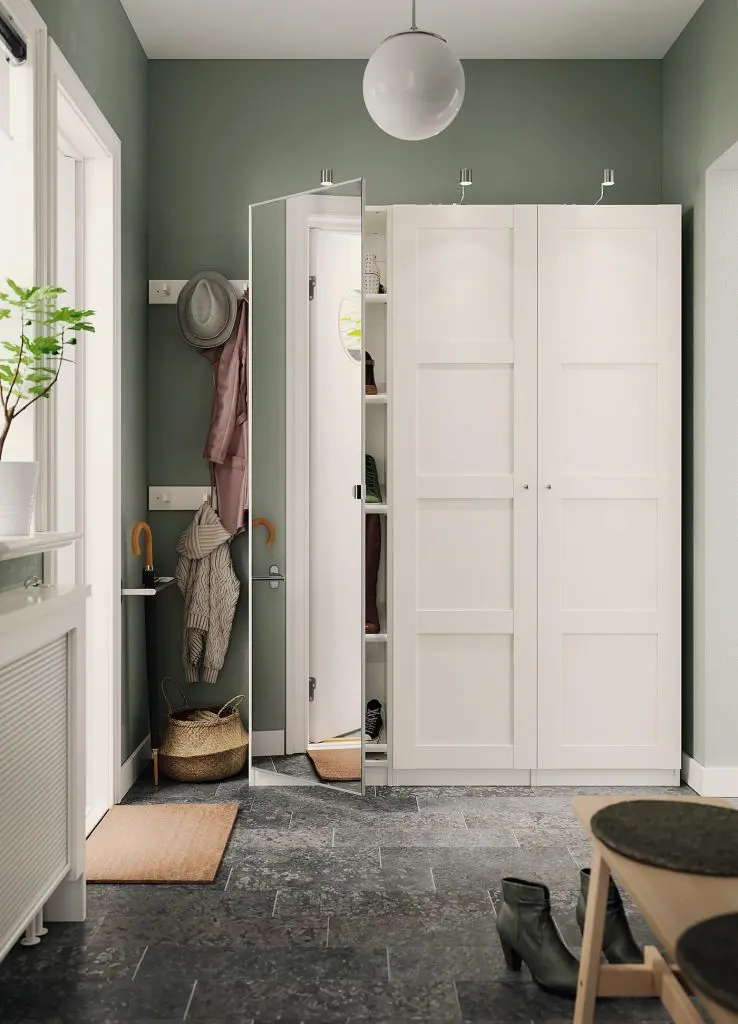 Классическая дверь на петлях современного дизайна с отделкой, имитирующей натуральную древесину, сделает интерьер теплым и уютным. Используйте для каркаса ПАКС с такой же отделкой, чтобы придать гардеробу гармоничный облик.