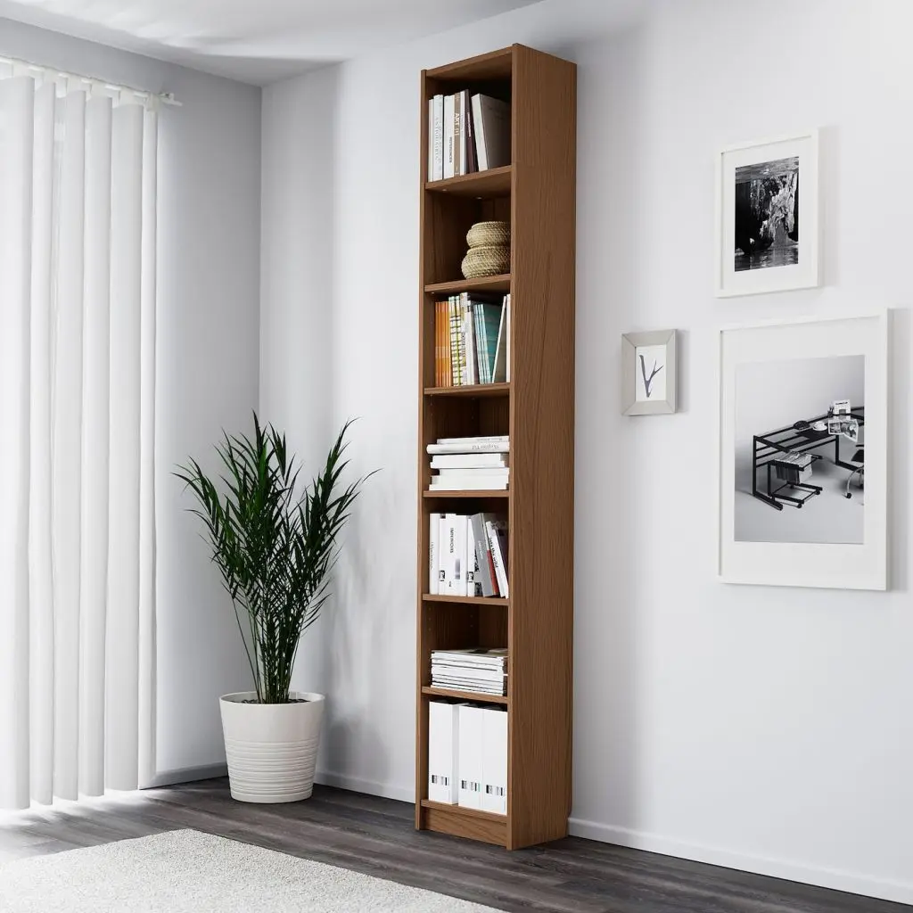 Стеллаж снабжен дополнительной верхней полкой: вы можете максимально задействовать поверхность стены.Съемные полки; устанавливайте на разном уровне в соответствии с необходимостью.Отделка из шпона. Для разных стен требуются различные крепежные приспособления. Подберите подходящие для ваших стен шурупы, дюбели, саморезы и т. п. (не прилагаются).Эту мебель необходимо крепить к стене с помощью прилагаемого стенного крепежа.Дизайнер
