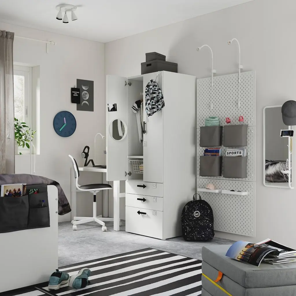 Ребенок может пользоваться этим гардеробом много лет, т. к. глубина шкафа позволяет развешивать в нем одежду на плечиках стандартного размера, а высоту его внутренних элементов можно менять по мере роста ребенка.Двери с петлями для плавного закрывания всегда закрываются бесшумно — даже в разгар жаркого спора.ВНИМАНИЕ! ОПАСНОСТЬ ОПРОКИДЫВАНИЯ! Незакрепленная мебель может опрокинуться. Эту мебель необходимо крепить к стене с помощью прилагаемого крепежа для предотвращения опрокидывания.1 платяная штанга, 2 полки, 1 проволочная корзина, 2 крючка для платяной штанги ХЭЛПА и 2 крючка/зажима ЛЭТТХЕТ прилагаются.Для разных стен требуются различные крепежные приспособления. Подберите подходящие для ваших стен шурупы, дюбели, саморезы и т. п. (не прилагаются).Чтобы вещи было легче находить, можно дополнить окошками для этикетки ХЭНГИГ (продаются отдельно)Ручки продаются отдельно.