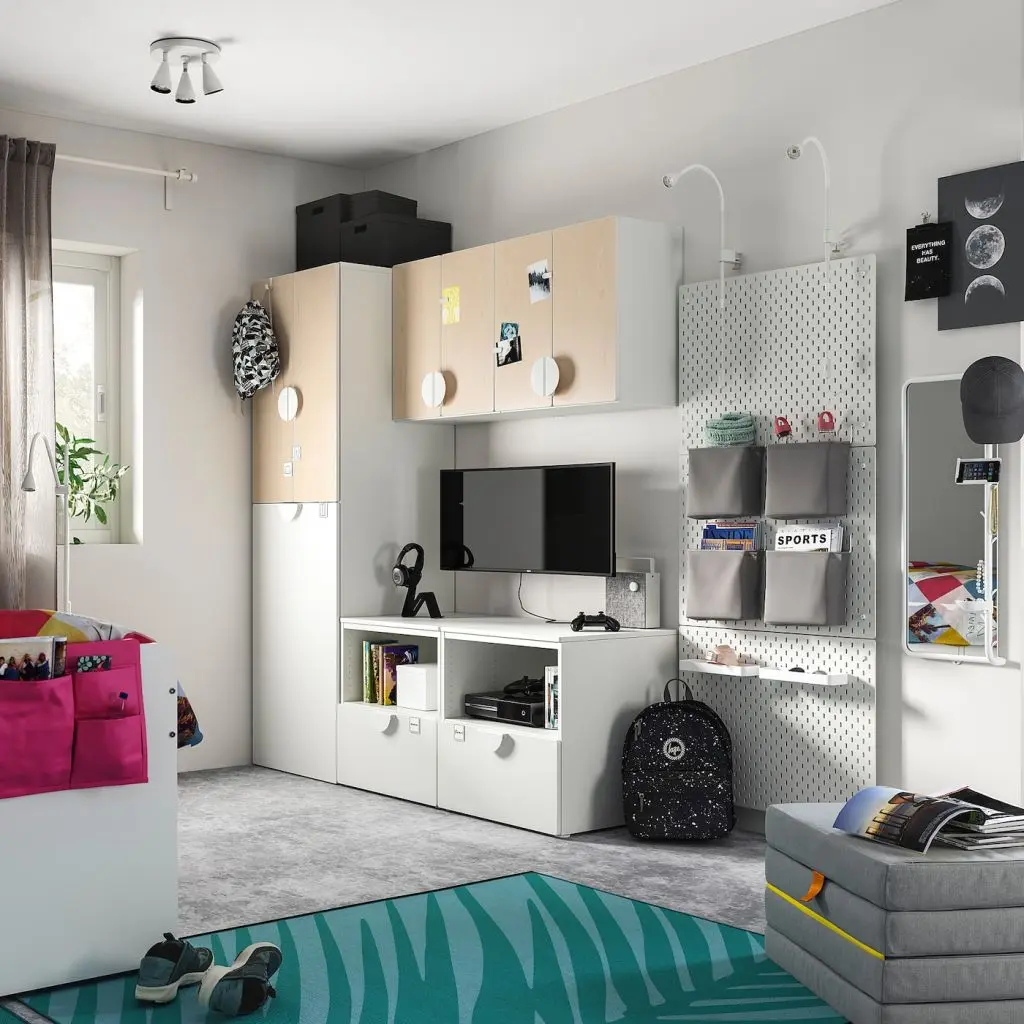 Такое решение дает вам много места для хранения и освобождает пространство для экрана или доски для записей на стене.Ваш ребенок сможет много лет пользоваться этим решением для хранения, так как по мере изменения потребностей вы можете менять внутреннее оснащение.В нижней части выдвижного модуля можно хранить все, что нужно быстро убирать с глаз долой.Благодаря крючкам изнутри и снаружи ребенку будет гораздо проще развешивать одежду, рюкзаки и другие вещи, которые обычно просто валяются на полу.Двери с петлями для плавного закрывания всегда закрываются бесшумно — даже в разгар жаркого спора.ВНИМАНИЕ! ОПАСНОСТЬ ОПРОКИДЫВАНИЯ! Незакрепленная мебель может опрокинуться. Эту мебель необходимо крепить к стене с помощью прилагаемого крепежа для предотвращения опрокидывания.Для разных стен требуются различные крепежные приспособления. Подберите подходящие для ваших стен шурупы, дюбели, саморезы и т. п. (не прилагаются).Можно дополнить ручками.Ручки продаются отдельно.