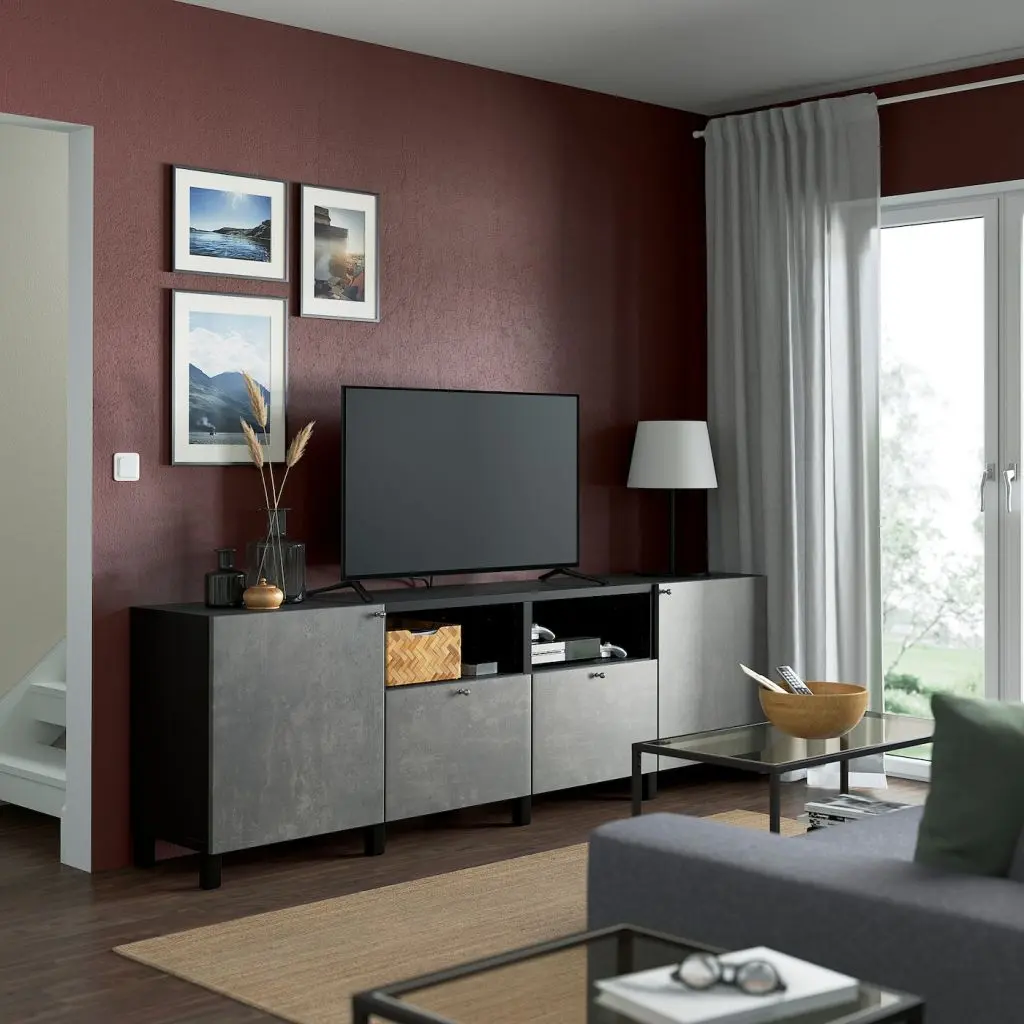 Специальное отверстие в верхней панели обеспечит удобное и компактное размещение проводов.Благодаря нескольким отверстиям на задней панели тумбы под ТВ провода от телевизора и других устройств всегда будут под рукой, но не на виду.Благодаря интегрированному нажимному механизму ящики открываются легким нажатием.Два ящика обеспечат порядок в хранении пультов, игровых приставок и других аксессуаров для ТВ.Съемные полки позволяют регулировать пространство.Организуйте и оптимизируйте систему для хранения БЕСТО, используя подходящие коробки и вставки.Для функционирования нажимного механизма необходимо пространство между каркасом и фронтальной панелью ящика, чтобы ящик открывался нажатием. Небольшой зазор необходим для обеспечения этой функции и не является недостатком товара.Тумбу под ТВ необходимо крепить к стене с помощью прилагающегося стенного крепежа.