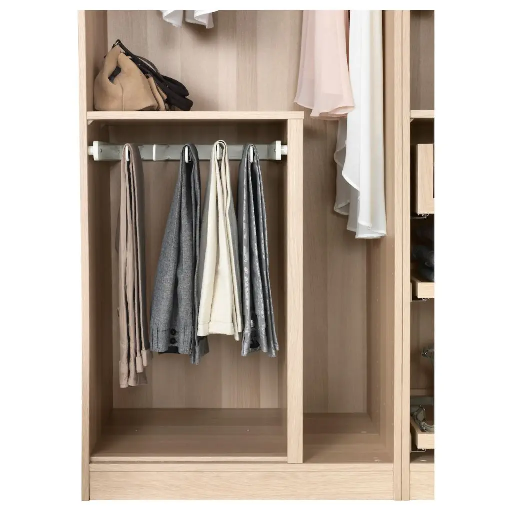 Используйте внутреннее пространство гардероба максимально эффективно. Повесьте короткую одежду над разделителем, длинную — рядом, а внутри разделителя установите полки, ящики и другие аксессуары для хранения вещей.