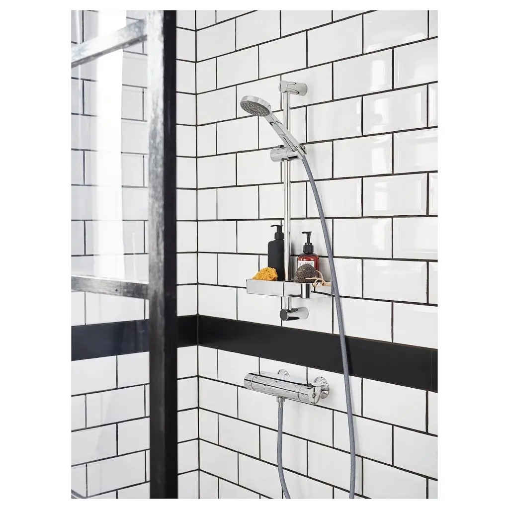 Бесплатно 3 года гарантии. Подробнее об условиях гарантии – в гарантийной брошюре.Полку легко установить на нужной высоте благодаря регулируемому креплению на душевой штанге.Вода легко проходит через отверстия в полке.Прочную хромированную поверхность легко поддерживать в чистоте.Подходит для душевой штанги диаметром 19–25 мм, установленной на расстоянии мин. 56 мм от стены.Можно дополнить другими товарами серии БРОГРУНД.Дизайнер