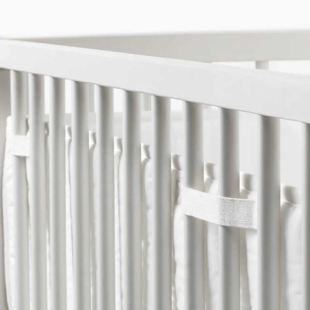 Благодаря мягкому бортику малыш не ударится о перекладины боковин кроватки. Застежки надежно фиксируют бортик в кроватке.