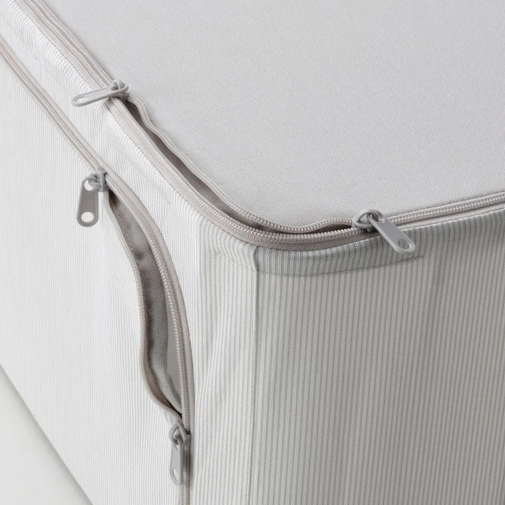 Эта текстильная коробка надежно защитит содержимое от пыли и загрязнений. Идеально помещается в гардероб и открывается сбоку, чтобы вы могли достать вещи, не снимая коробку с полки.