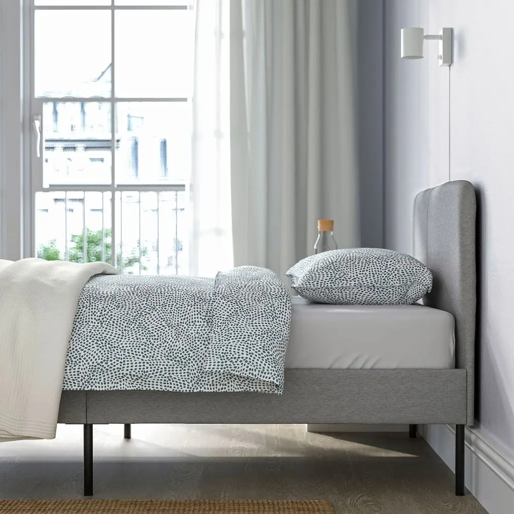 Мягкая тканевая обивка придает спальне уютный вид. На изголовье можно удобно опереться, чтобы почитать перед сном. Все компоненты каркаса продаются в одной упаковке. Удобно, не правда ли?