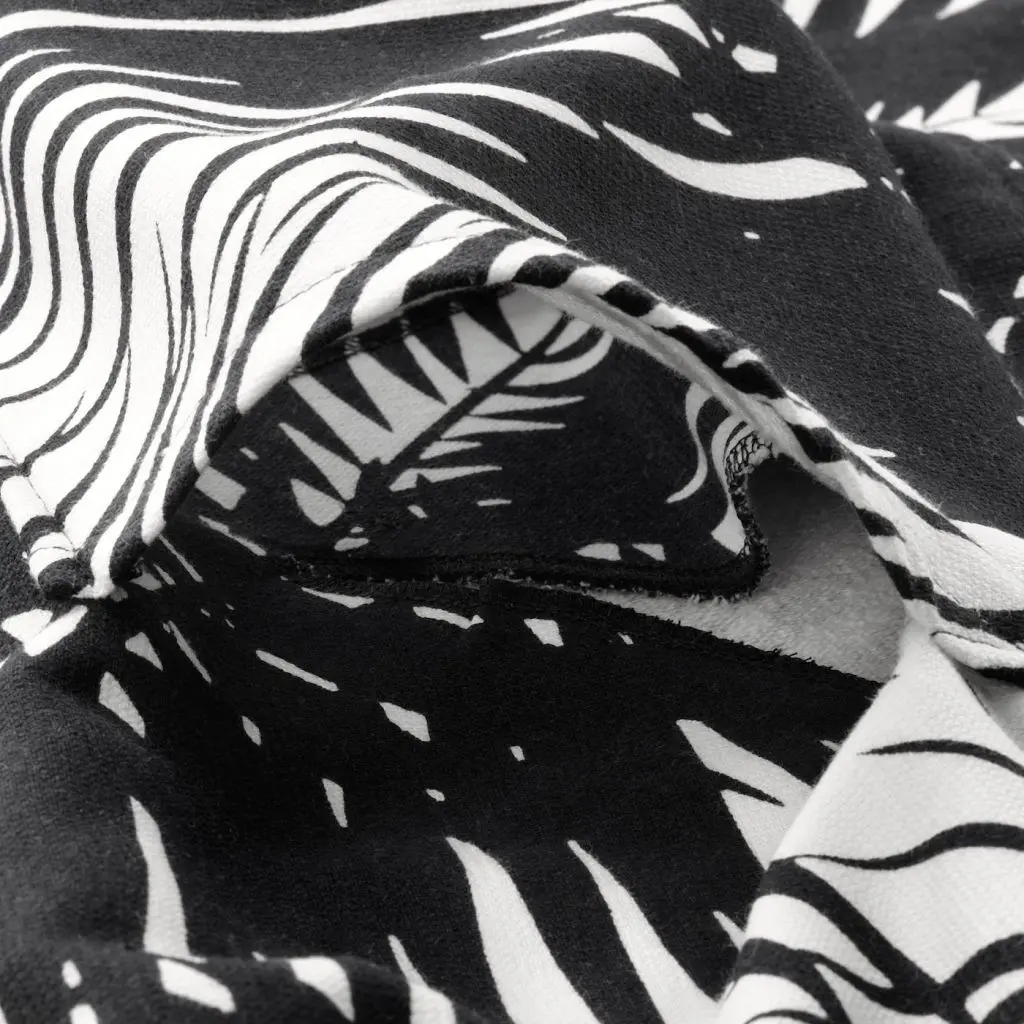 В этом черно-белом полотенце-пончо свободного кроя вы сможете без проблем переодеться на пляже, просто продев руки в специальные отверстия внутри большого накладного кармана.