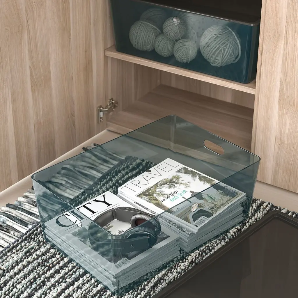 В самом большом контейнере серии КУГГИС достаточно места для хранения игровых приставок, аксессуаров для хобби и одежды. Контейнер изготовлен из прочного частично переработанного прозрачного пластика, поэтому его содержимое хорошо видно.