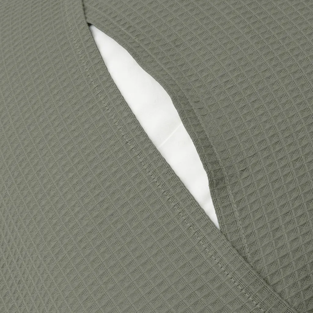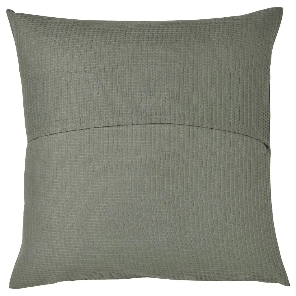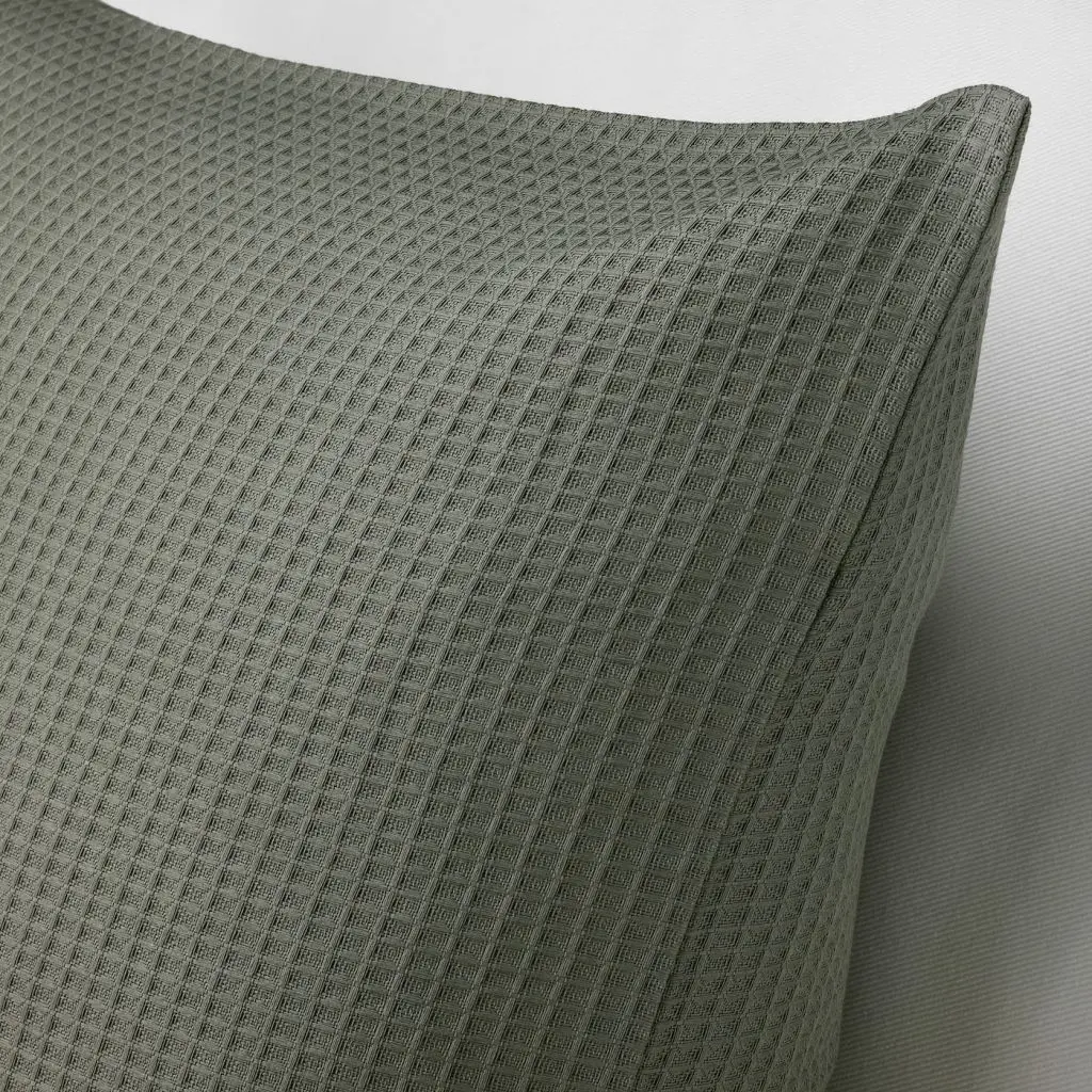 Чехол на подушку из чистого хлопка украшен приятным на ощупь вафельным узором. Светлый серо-зеленый цвет прекрасно сочетается с текстилем сходных или контрастных цветов.